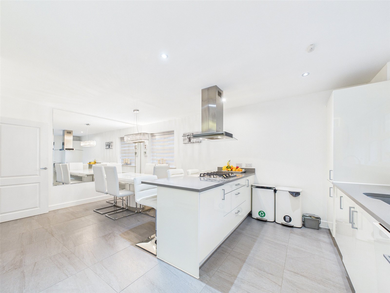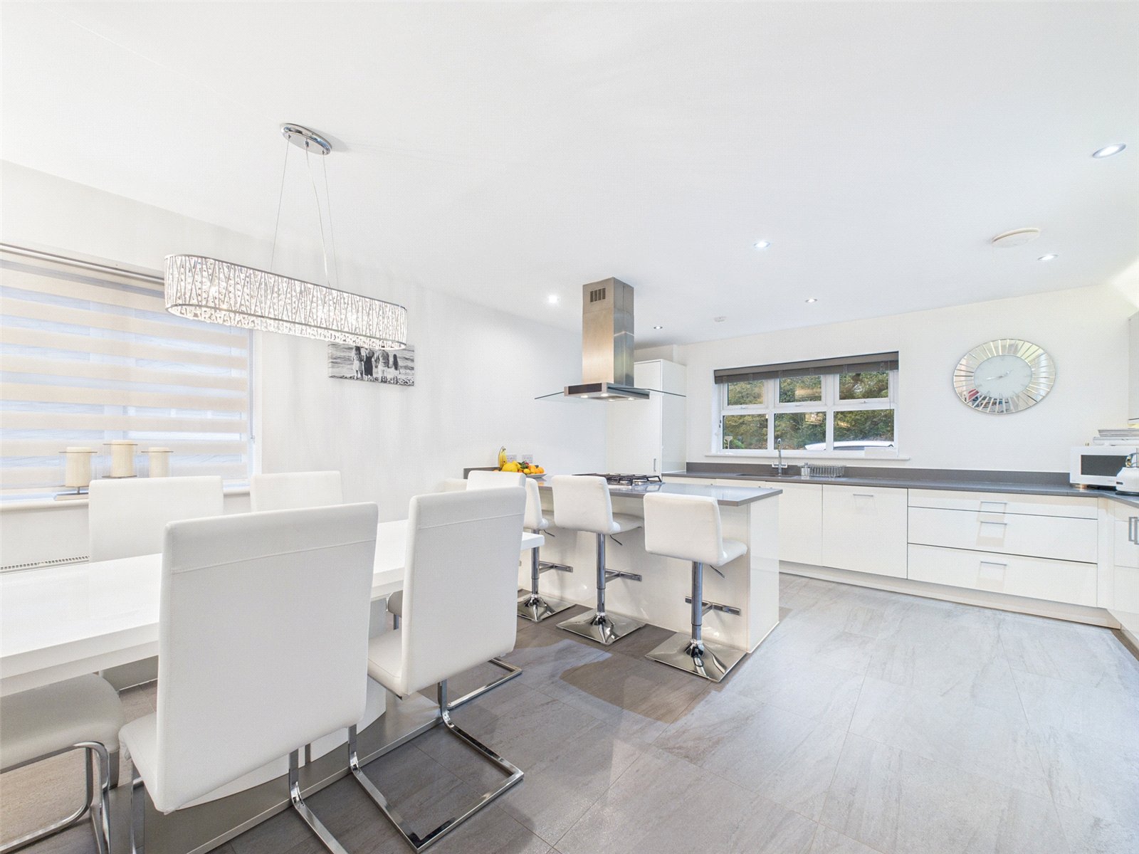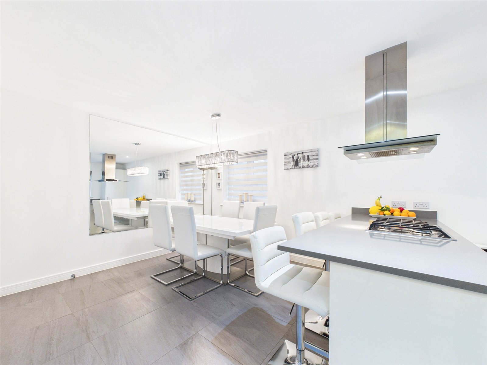 The spacious and impressive Kitchen/Dining Room, which measures 18ft. in length, enjoys a pleasant outlook to the front of the property. A white gloss fronted Kitchen offers a large selection of soft-close cupboard and drawer units, high quality integrated appliances include an 'AEG' double oven and grill, an 'AEG' four ring gas burner with a matching stainless steel extractor canopy over, together with a tall fridge/freezer and an 'AEG dishwasher. There is ample space for a large dining room table with feature pendant lighting over.