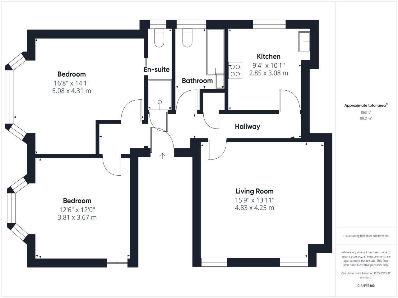 The apartment comprises a bright 16ft lounge/dining area, a modern fitted kitchen with a gas hob, electric oven, dishwasher, washing machine, and fridge/freezer, a 16ft master bedroom with a contemporary en-suite shower room, a second 15ft double bedroom, and a modern high-spec bathroom.