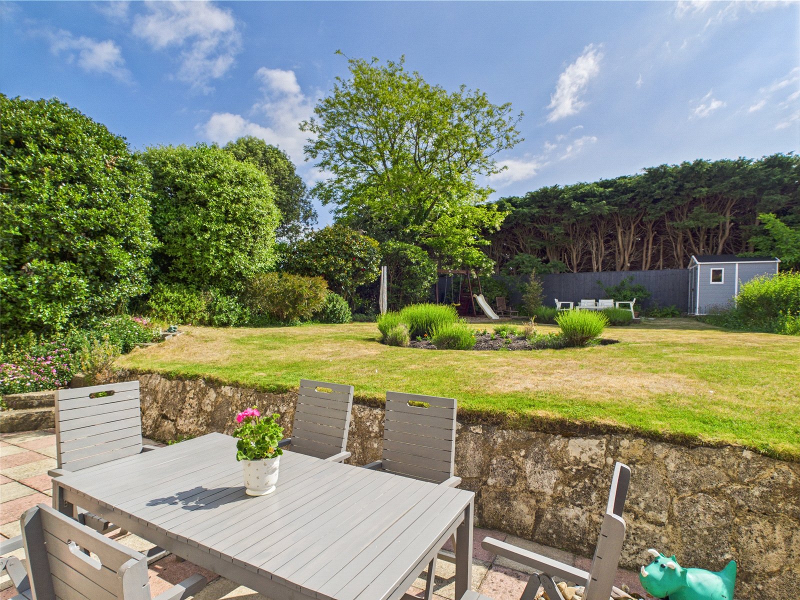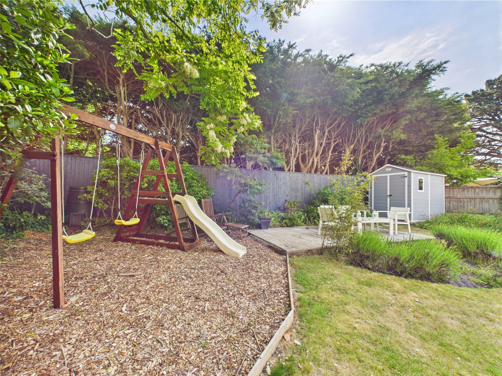 The rear garden is a great size and affords a good deal of seclusion from neighbouring homes. A patio area abuts the rear of the home with steps then leading to a raised lawn with inset and bordering flower/shrub beds. Ideally placed to capture the late afternoon/evening sun there is a second patio towards the rear boundary as well as a children’s play area and storage shed.