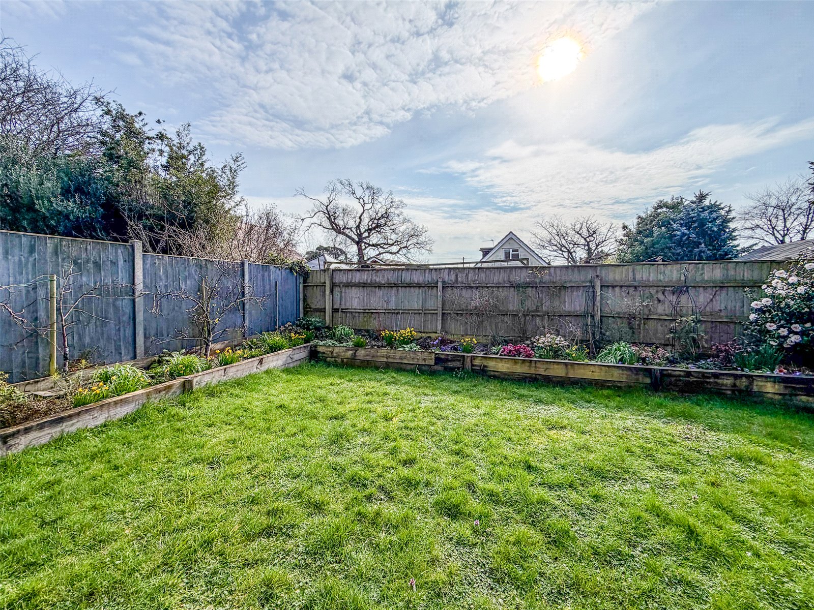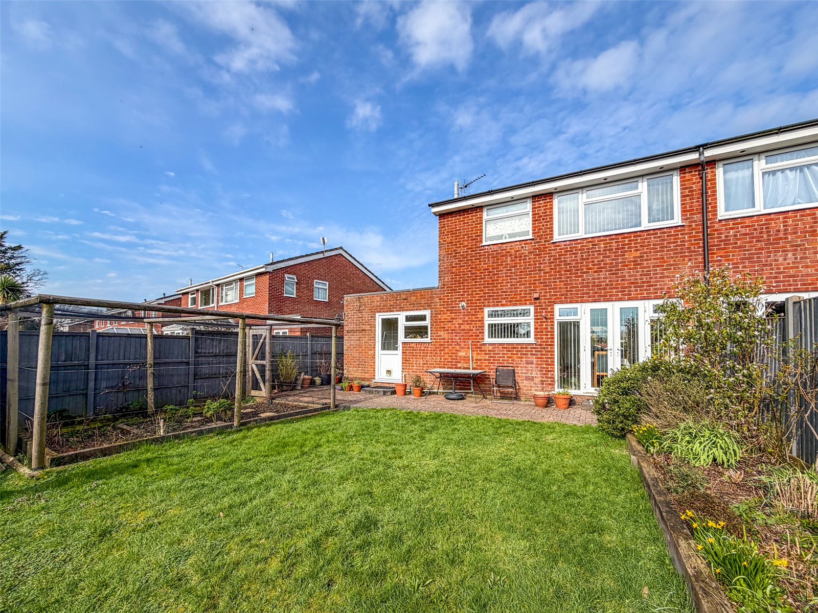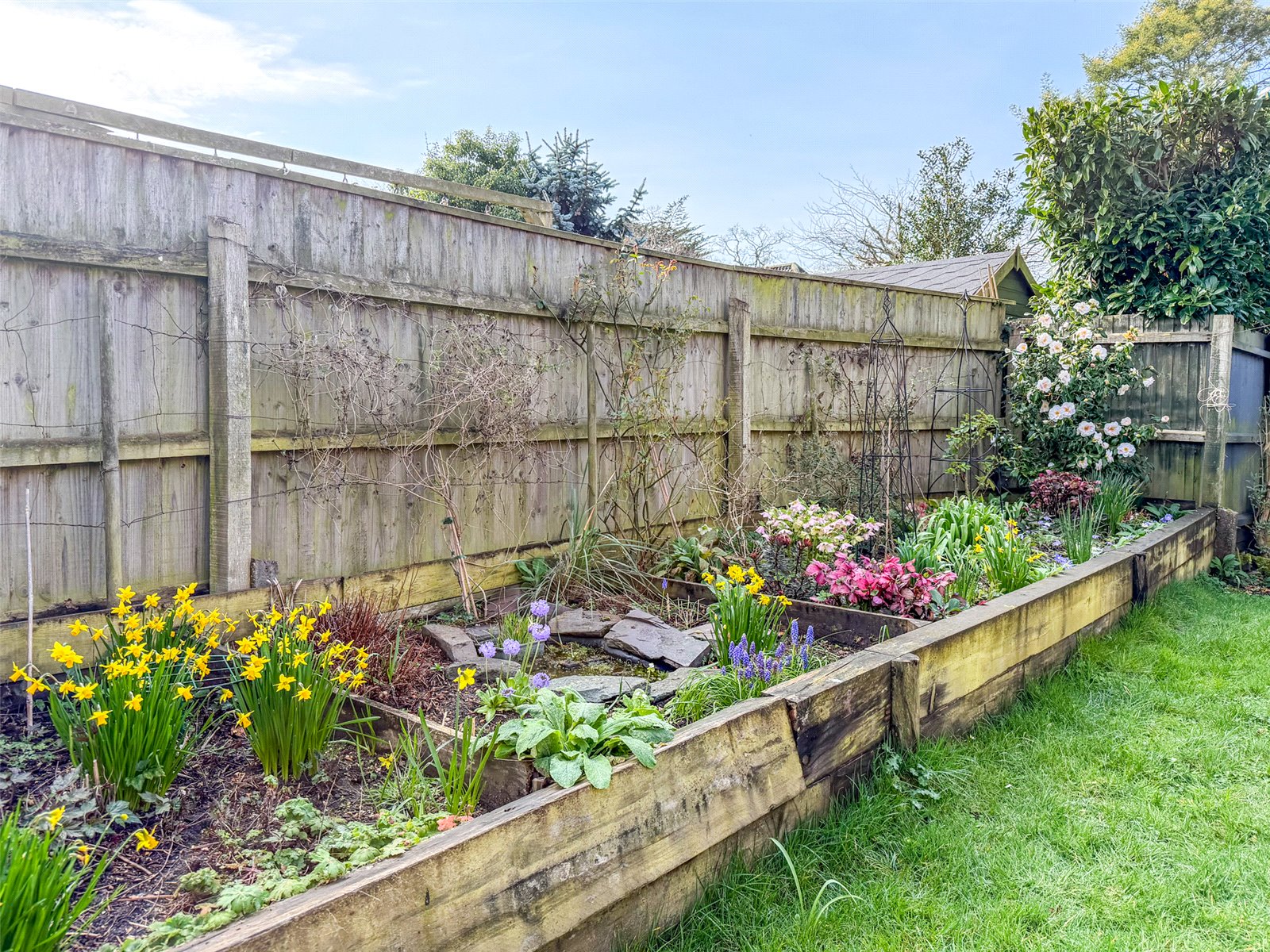 REAR GARDEN: South facing, large paved patio immediately abutting the rear. Well enclosed by fencing. Raised beds with a variety of shrubs, perennials, bulbs and climbing plants, including a dwarf wisteria and espalier plum and pear along the fence. Area of lawn and enclosed fruit and vegetable cage, with rhubarb behind.