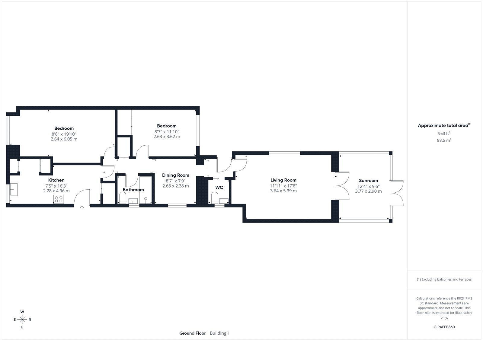 Via the dining room, you enter the large dual aspect living room. Double doors lead into the sun room, where further doors lead into the garden.