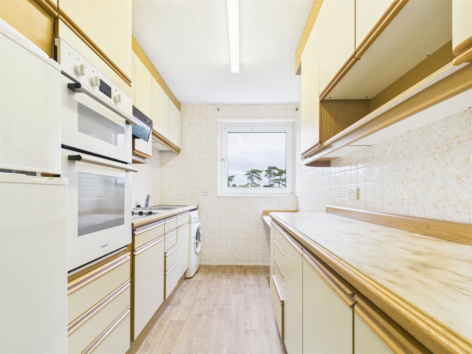 The galley kitchen has a range of eye and base level units with cupboards and drawers, space for appliances and white goods, and an integrated oven and hob.