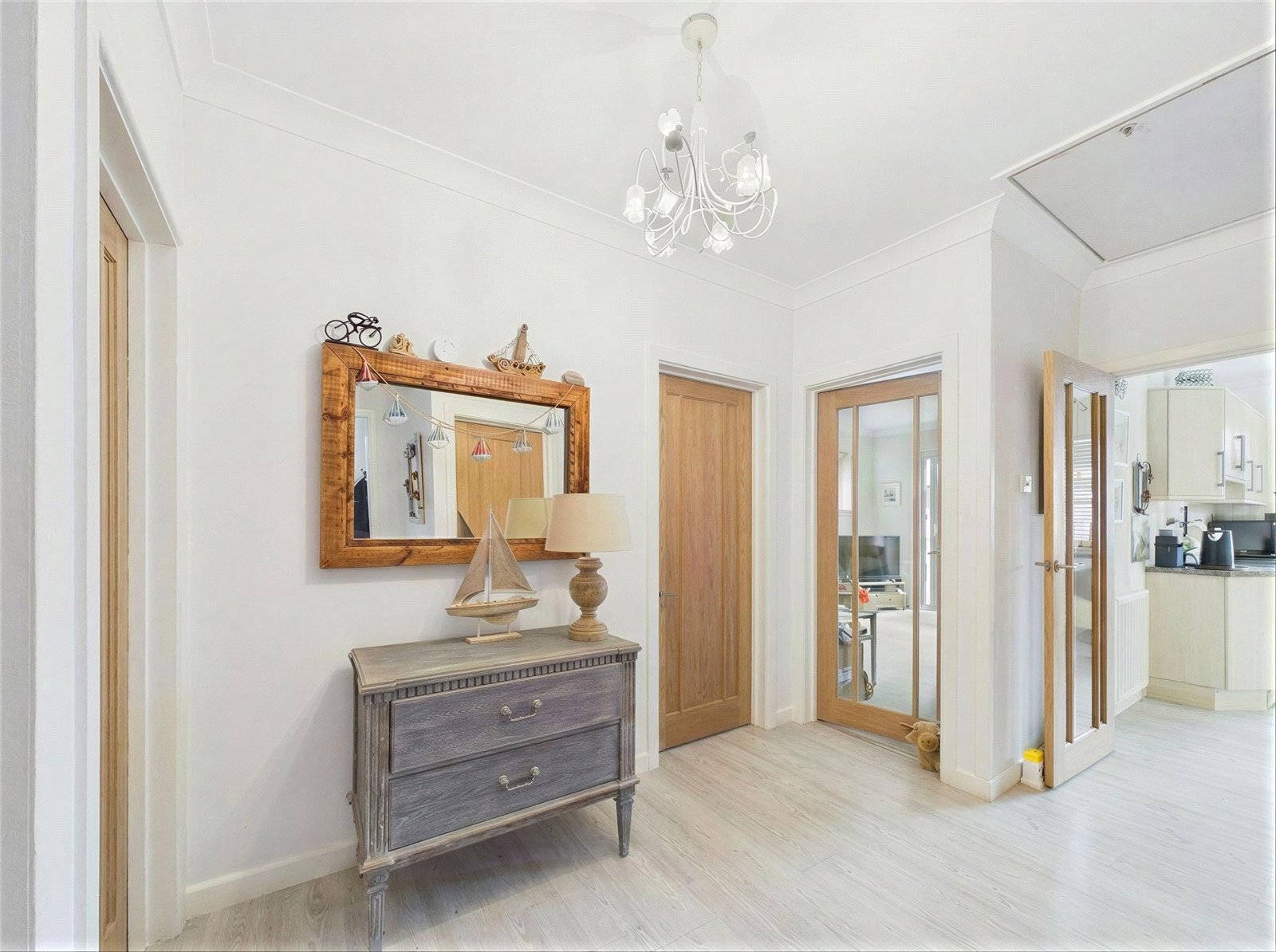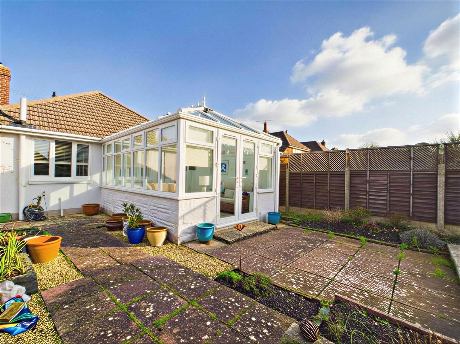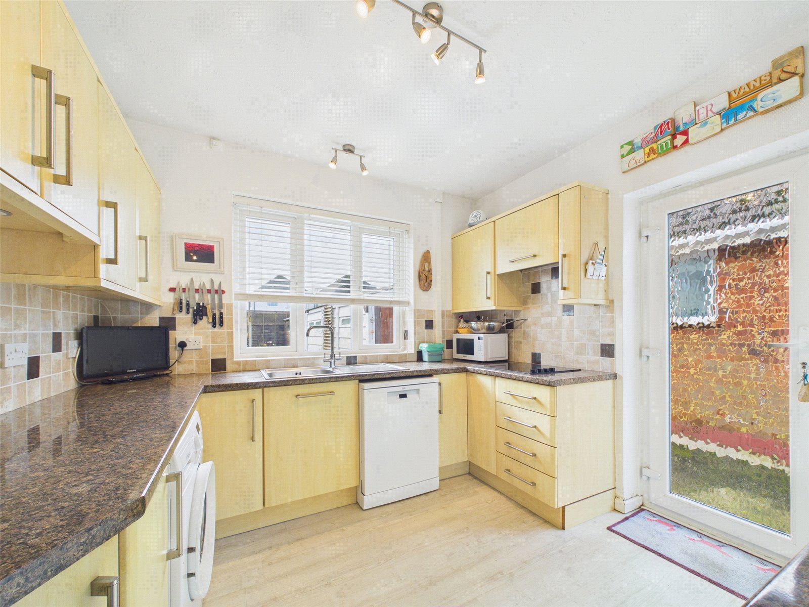 The kitchen offers a range of modern eye level and base units with some built in appliances and a partly glazed door giving access to the side of the bungalow.
