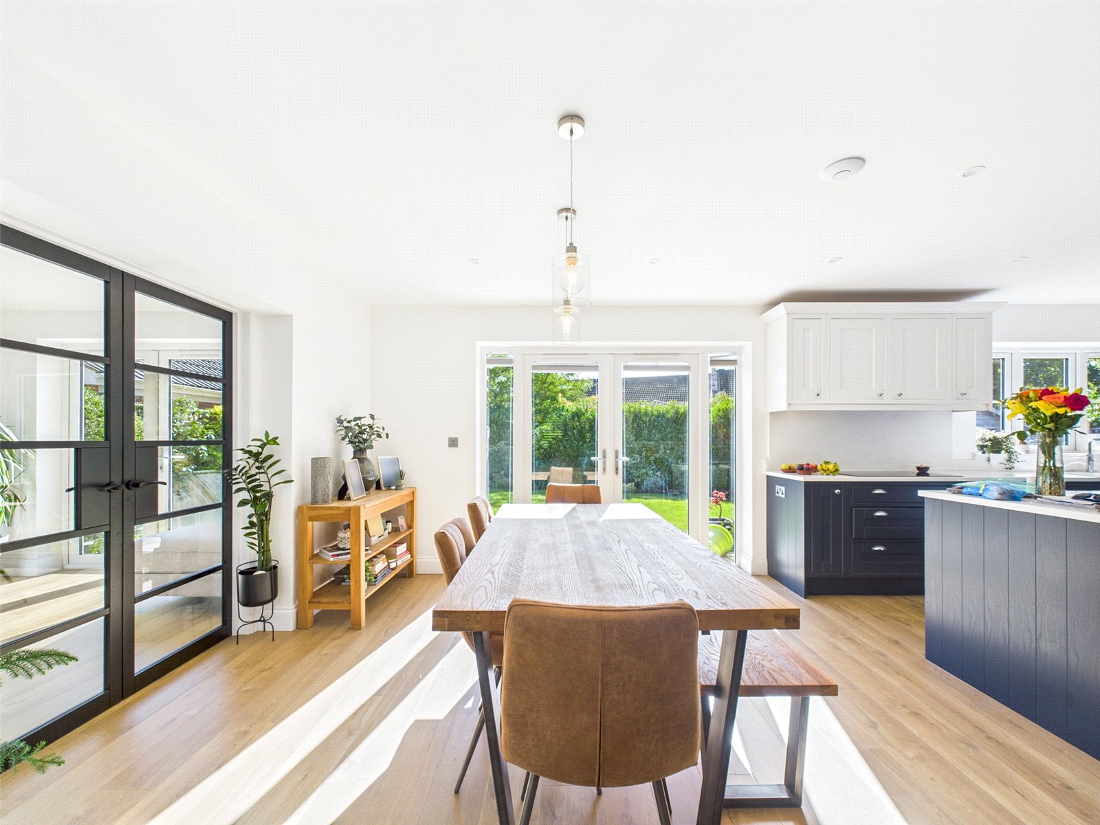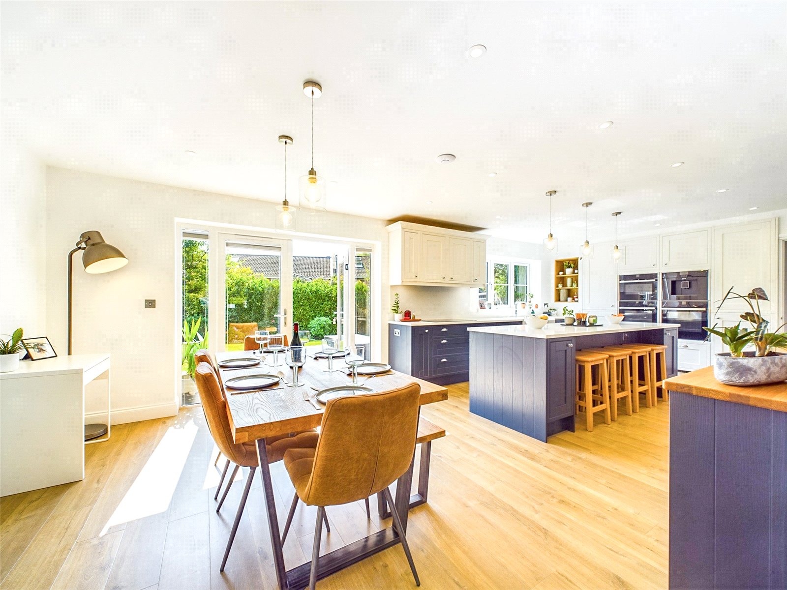 The open-plan Kitchen/Dining Room is situated to the rear of the property with an outlook over the Garden. The modern Kitchen offers a comprehensive range of cupboard and drawer units, complemented by a contrasting Quartz work surface, there is also a matching centre island. The Kitchen benefits from a Neff fitted double oven, an inset Neff induction hob with a contemporary extractor canopy over, a Bosch fitted dish washer and an integrated Fridge/Freezer, Integrated Neff Coffee machine, Quooker tap and a Caple wine cooler. Furthermore, there is a door to a useful Utility Room with an additional work surface and sink with space and plumbing for additional Kitchen appliances.
