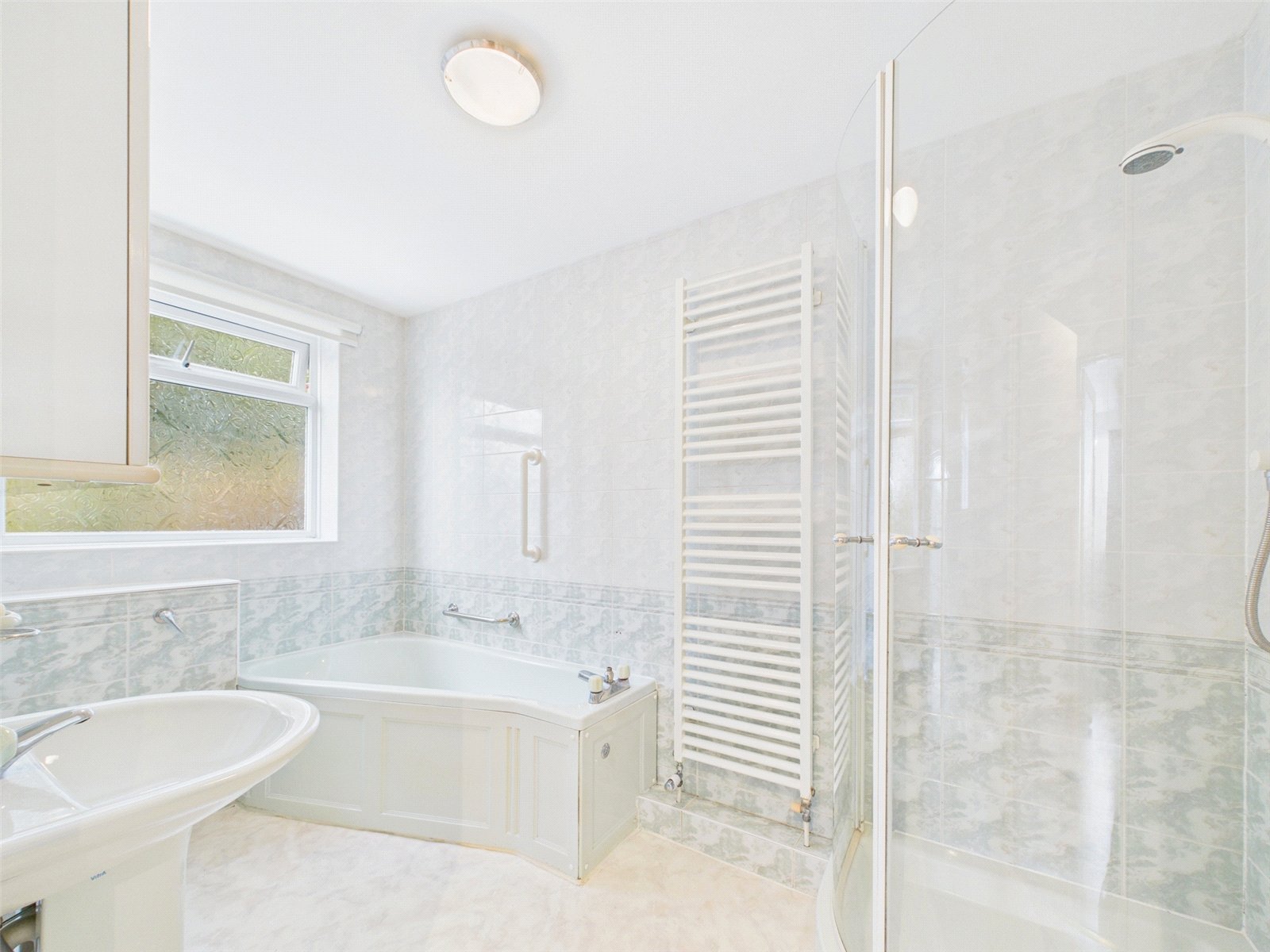 The bedrooms are served by a modern bathroom which has been fitted with a panel enclosed bath, walk in shower cubicle, low level flush WC and pedestal wash hand basin. The walls are fully tiled and there is a UPVC obscured window to the side aspect.