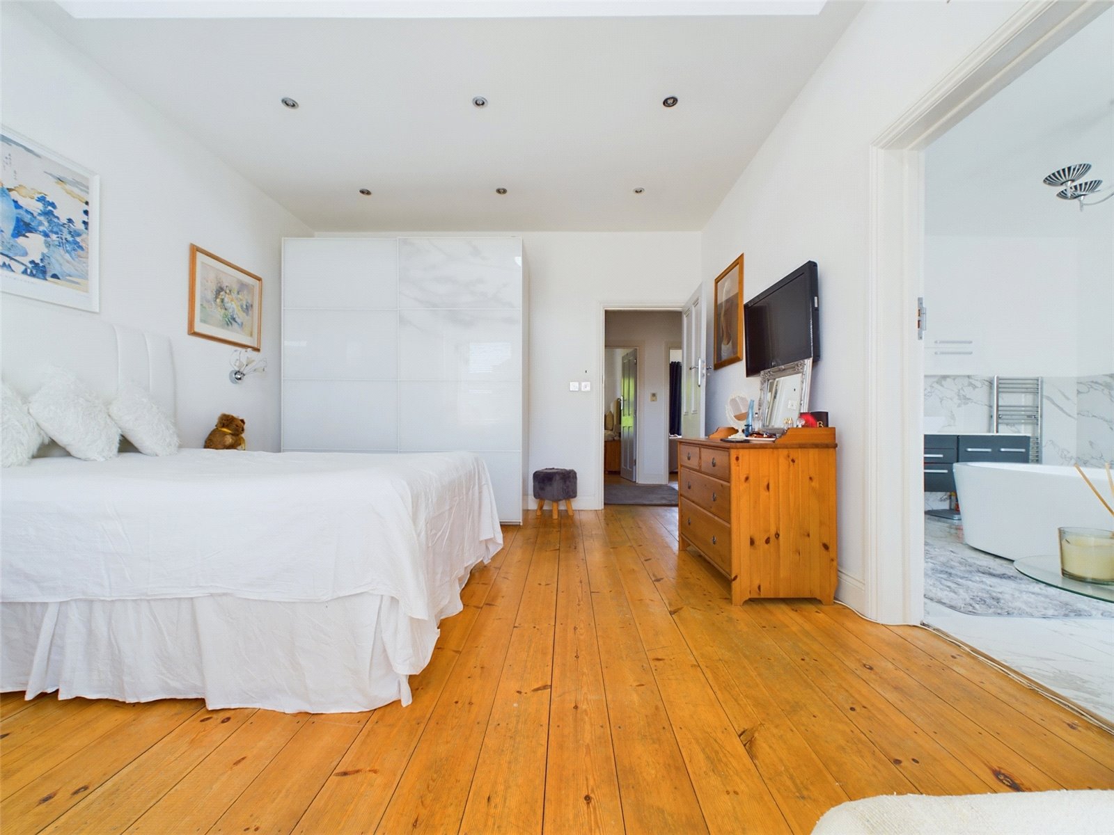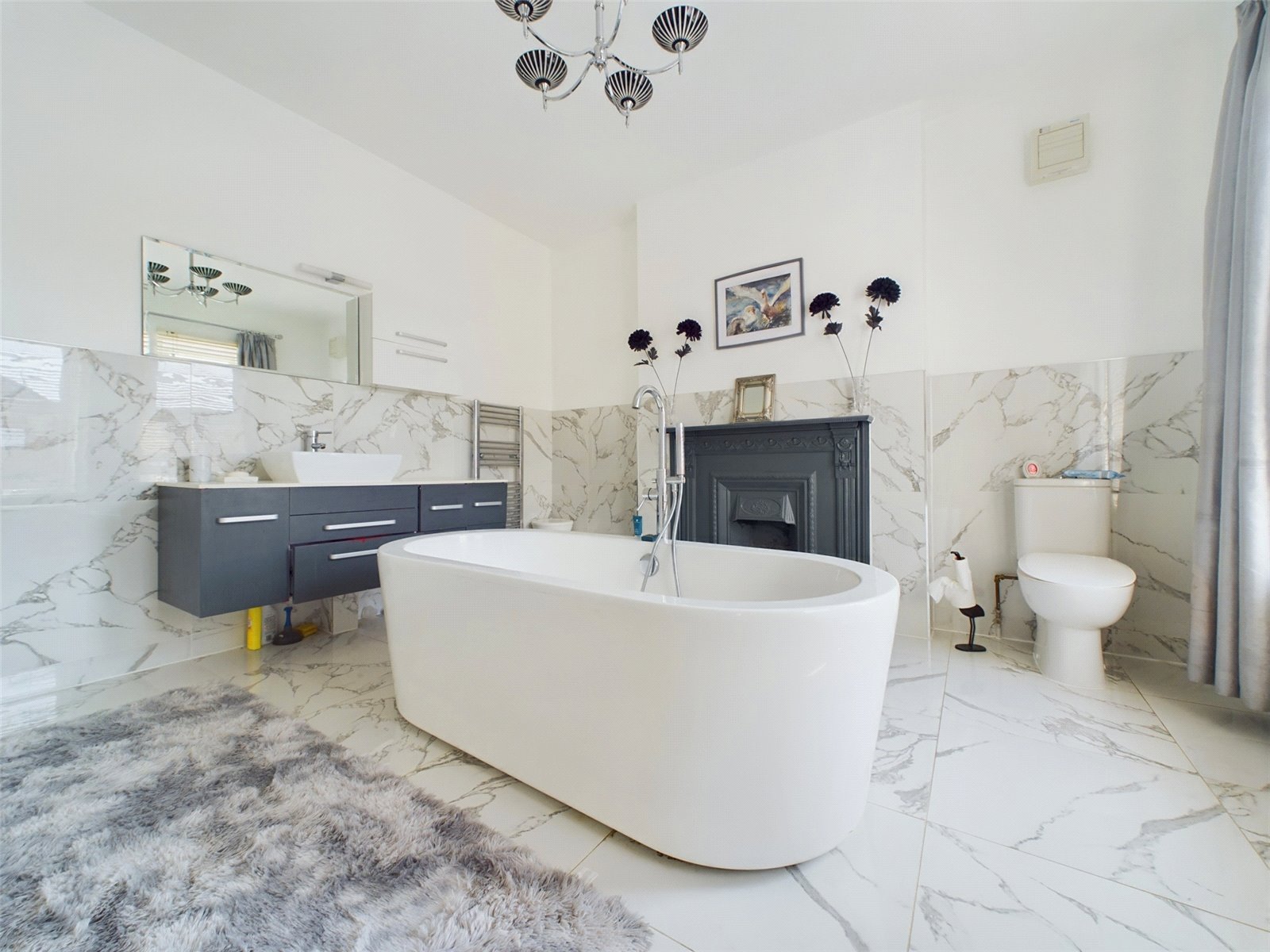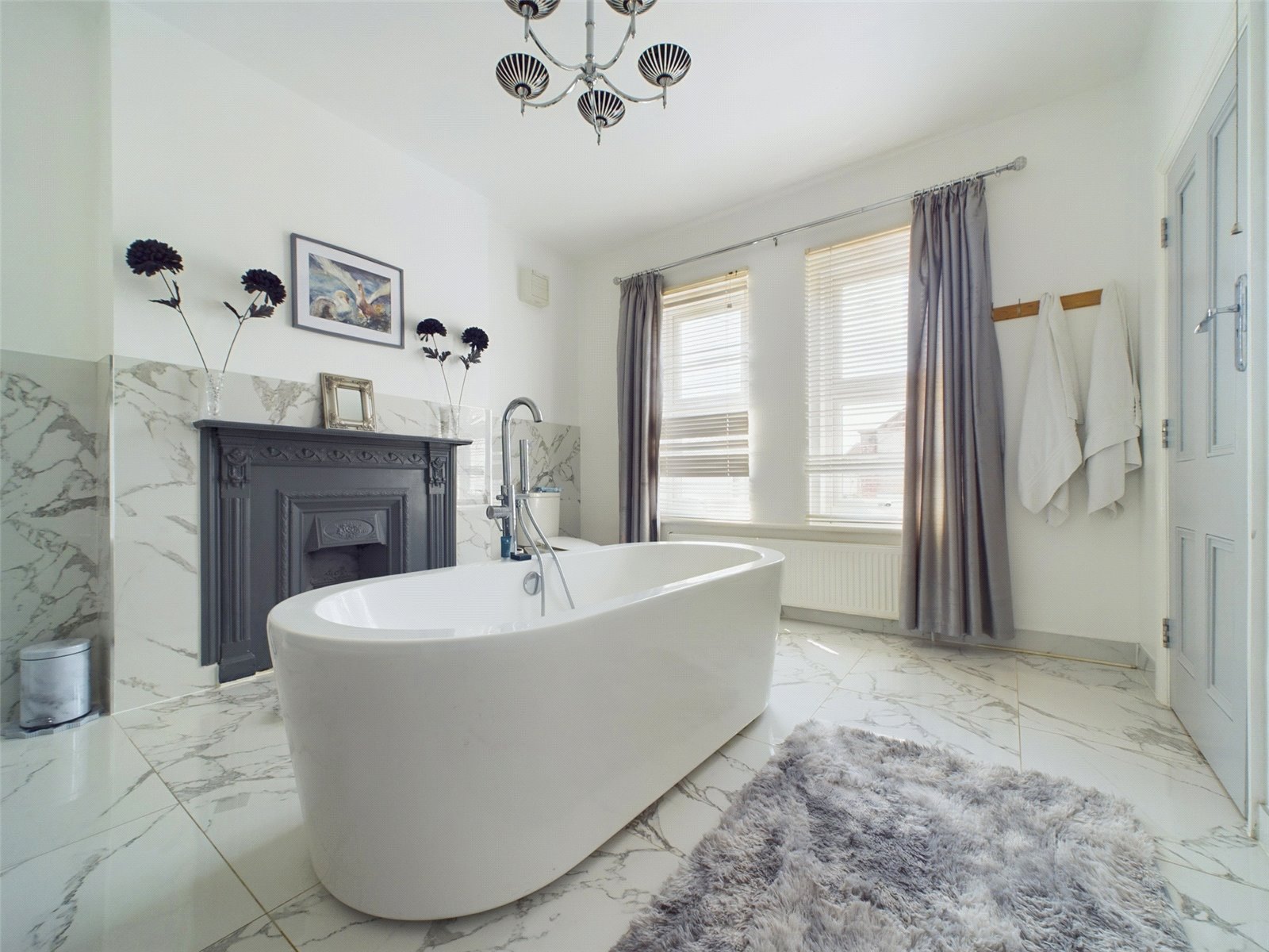 A door leads from the bedroom into the En-Suite bathroom, which wouldn’t look out of place in a luxury hotel suite. Originally the fourth bedroom, the En-suite is a great size and oozes opulence with a freestanding bath, marble effect tiling and an original fireplace.