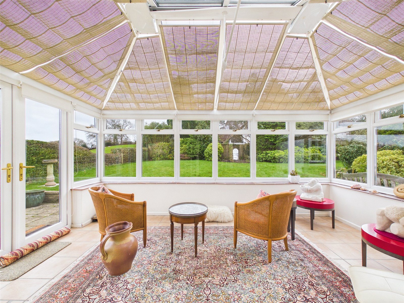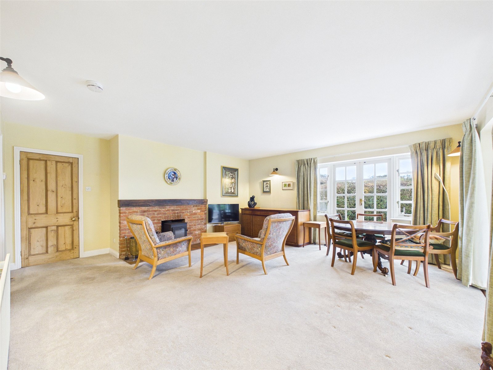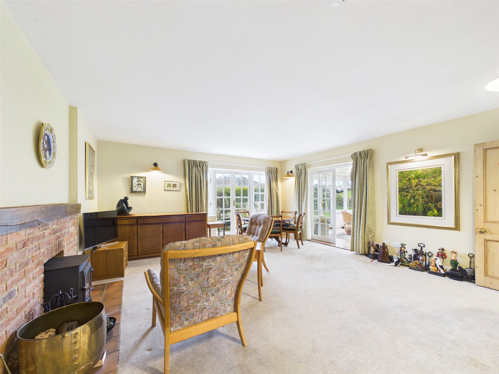 A large dual aspect Living Room features a red brick fireplace with a wood burning stove. Twin doors lead to a sizeable Conservatory enjoying an attractive outlook over the Garden and fields beyond.