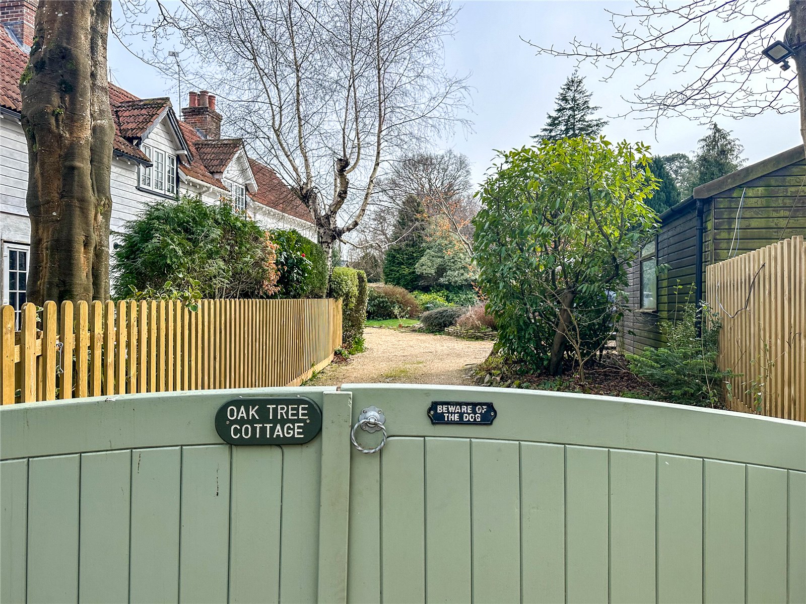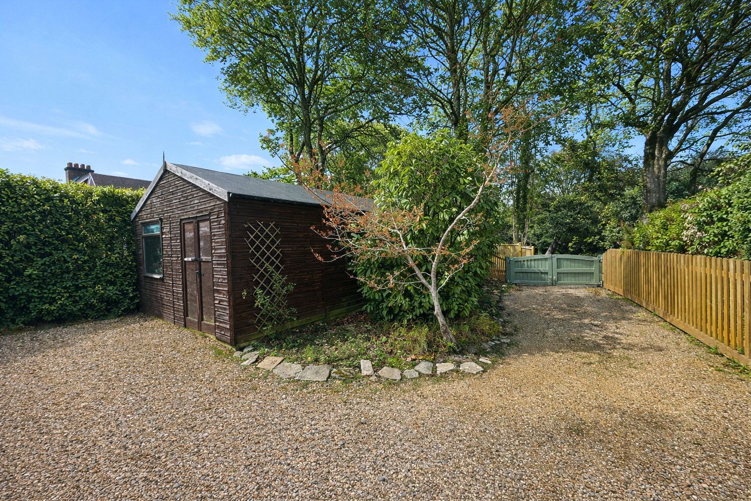 The property is approached via a gated gravel Driveway with an adjacent Garage.