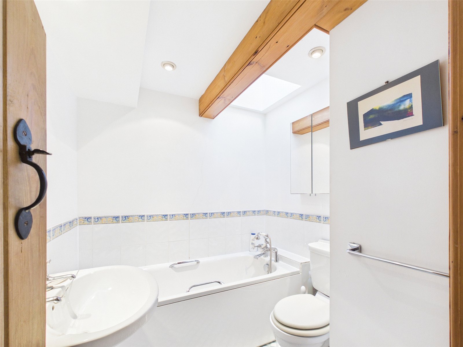 The principle Bathroom offers a matching white suite, complemented by a skylight.