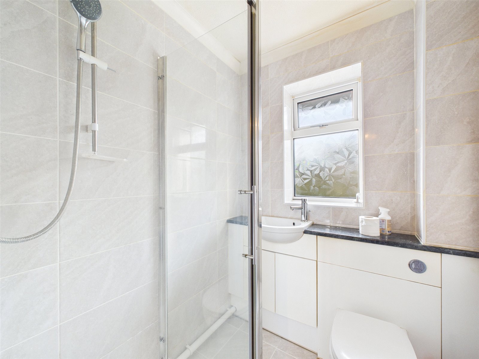 A modern shower room benefits from tiled walls, wash hand basin & wc.