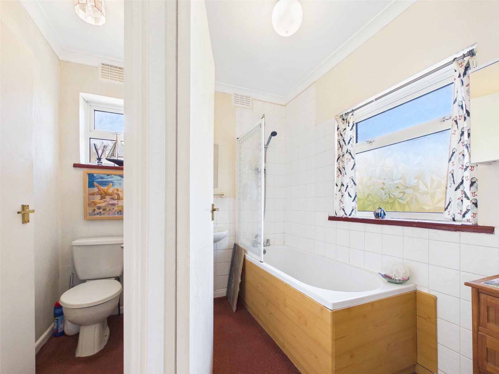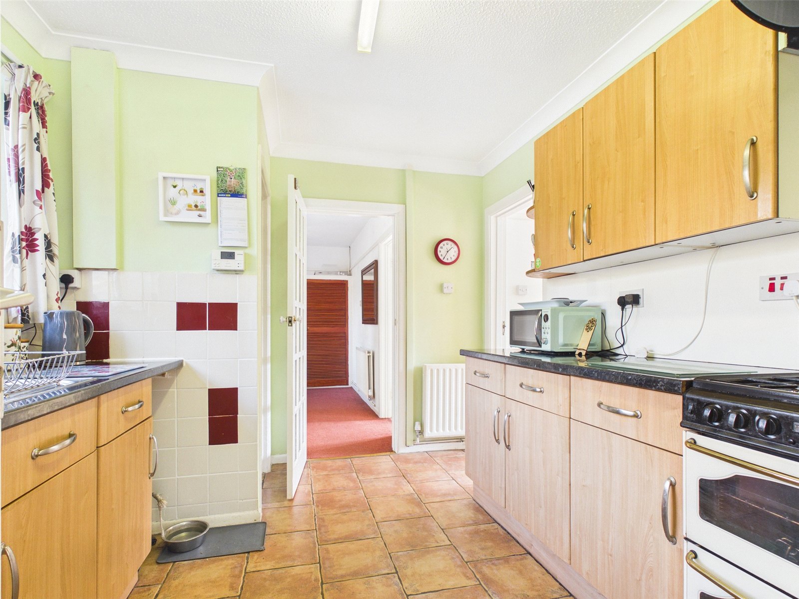 The kitchen comprises a range of eye and base level units with cupboards and drawers. Space for appliances and white goods. Understairs cupboard where modern gas boiler is located, the airing cupboard with hot water cylinder is on the landing. Door leads to the enclosed area between the house and garage where there is a WC, shower area and useful storage space.