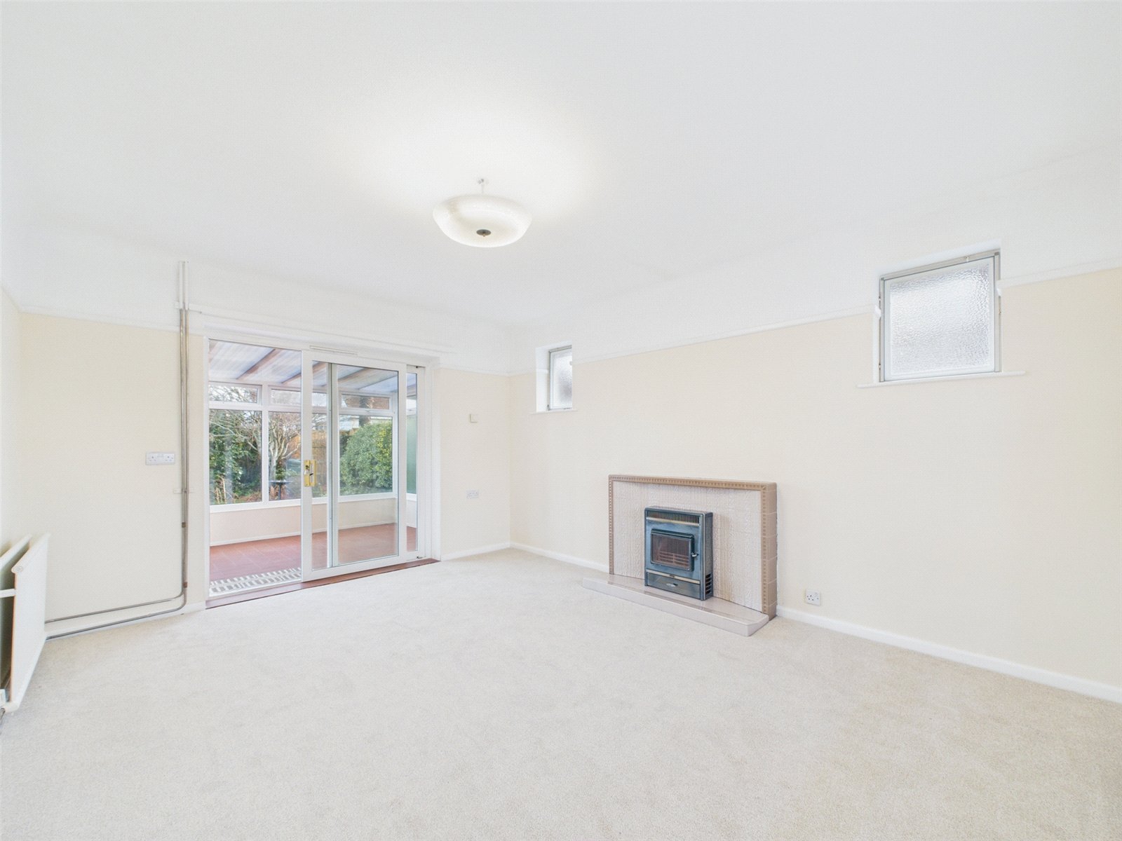 Benefitting from a large front aspect window, additional side windows, and glazed patio doors leading to a sun lounge, the living room is bright and features a tiled fireplace with fitted stove.