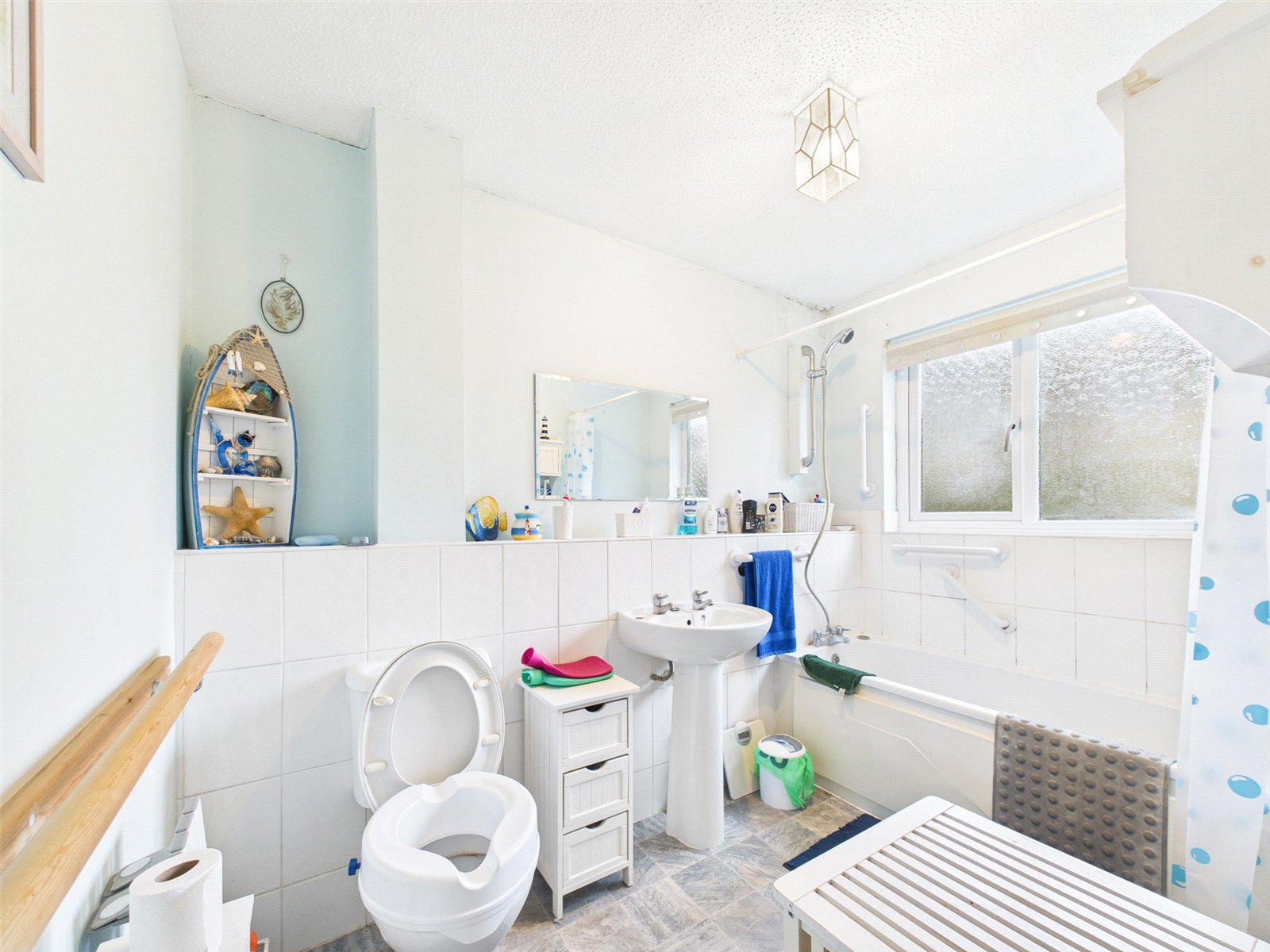 A spacious Family Bathroom benefits from a matching white three piece suite.