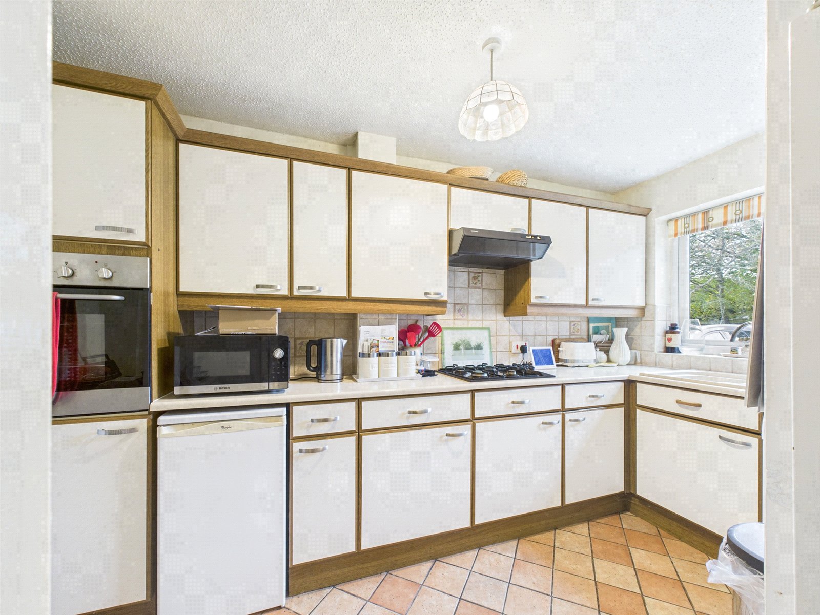 The Kitchen is fitted with a comprehensive range of cupboard and drawer units with an integrated oven and hob.