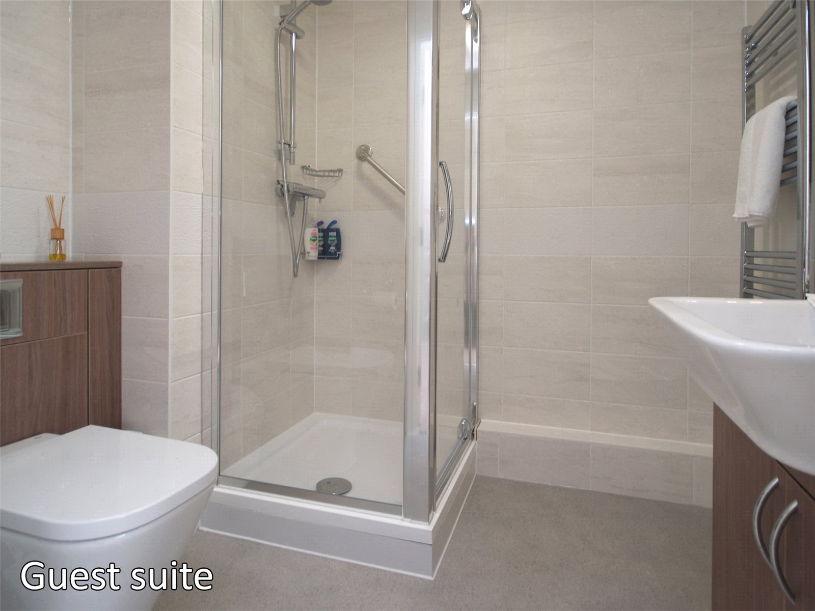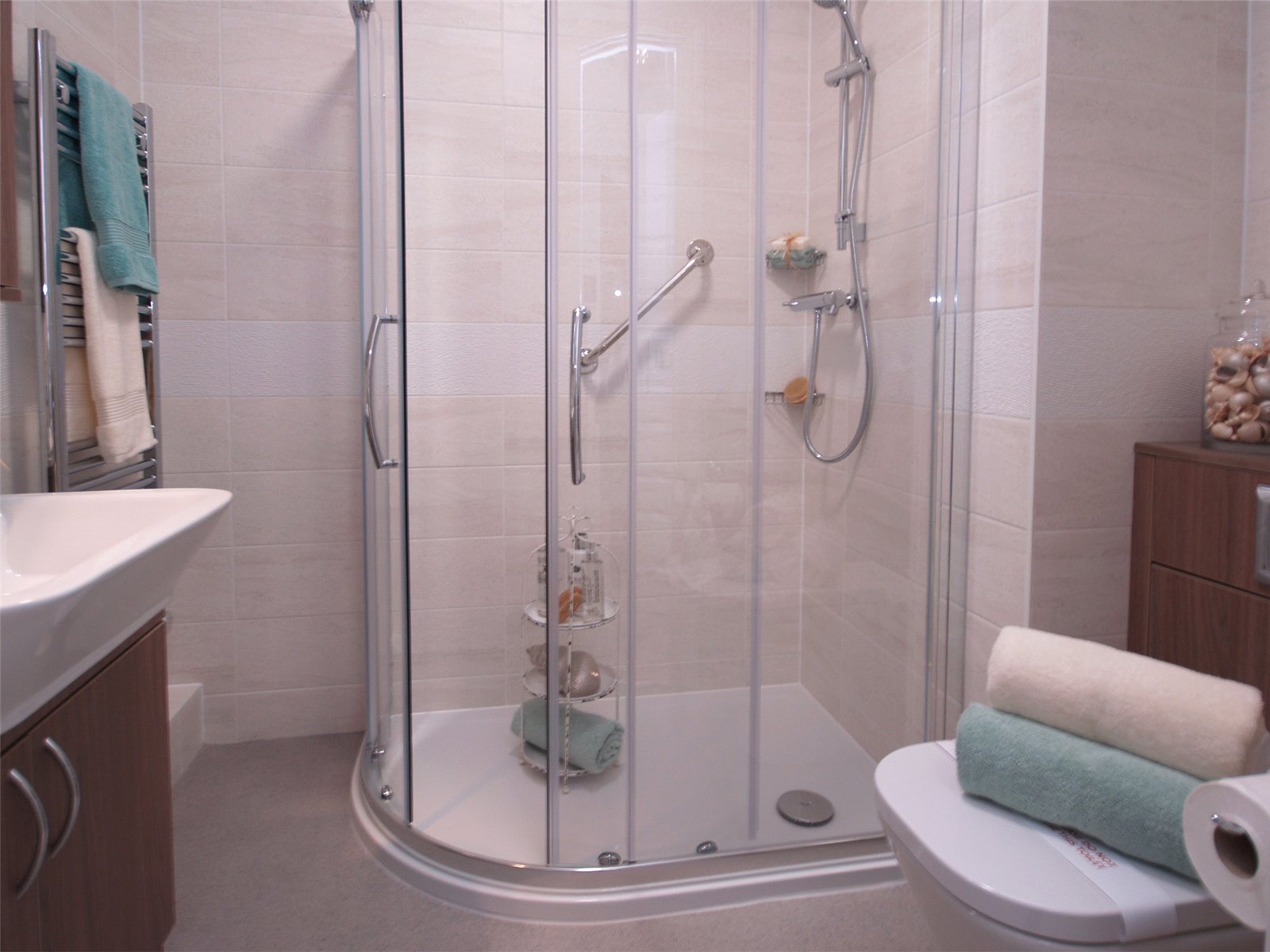 The shower room comprises a large walk in shower, a push button WC, and a wash hand basin with storage under and above, along with a vanity mirror. Tiled walls and a heated towel rail.