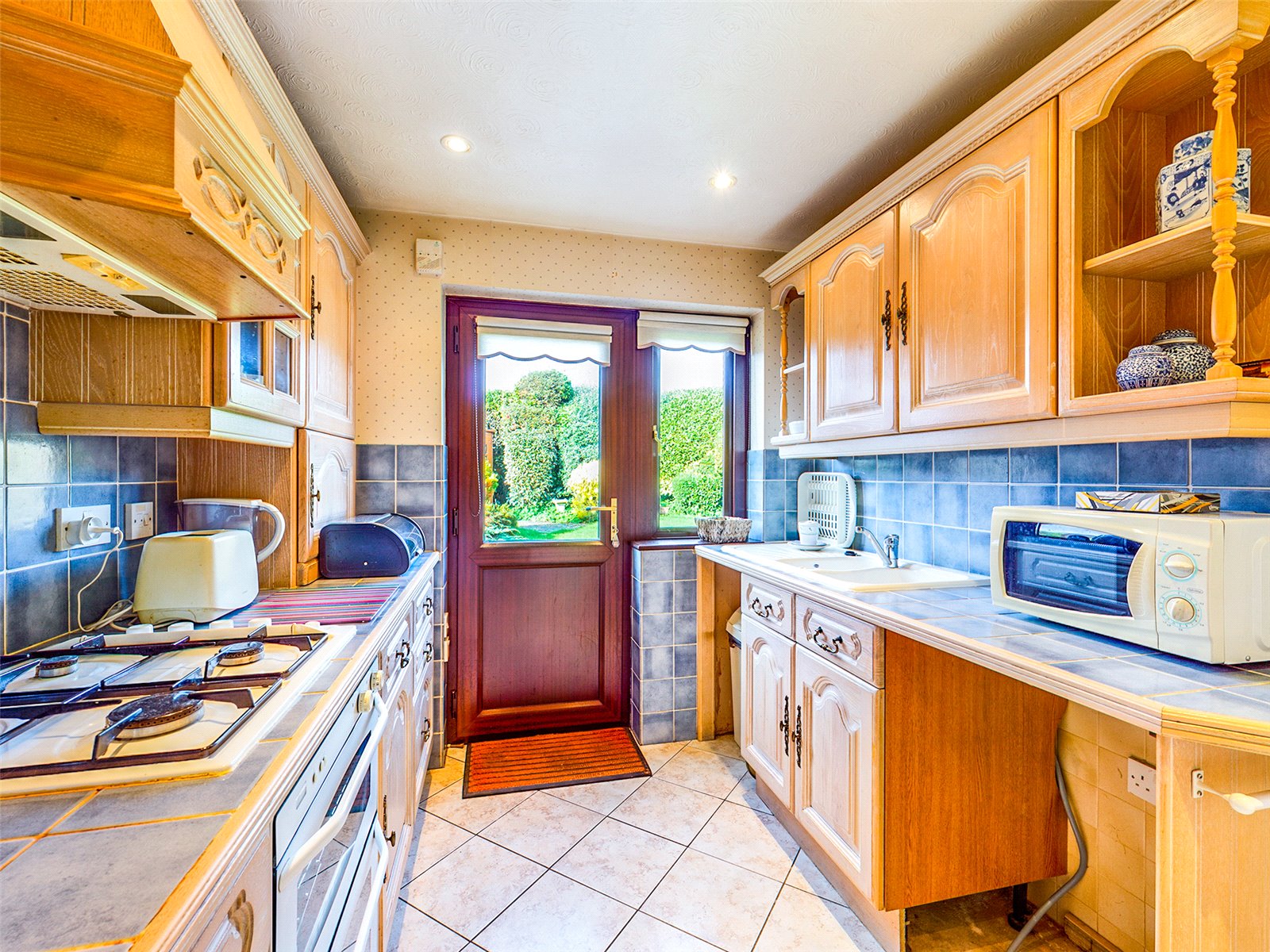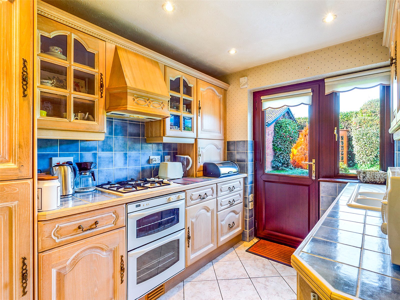 In the kitchen is a range of eye and base level units with cupboards and drawers, with worktops over. Integrated fridge and freezer, and a double oven with gas hob. Space for other appliances, inset sink and drainer, and a door into the garden.