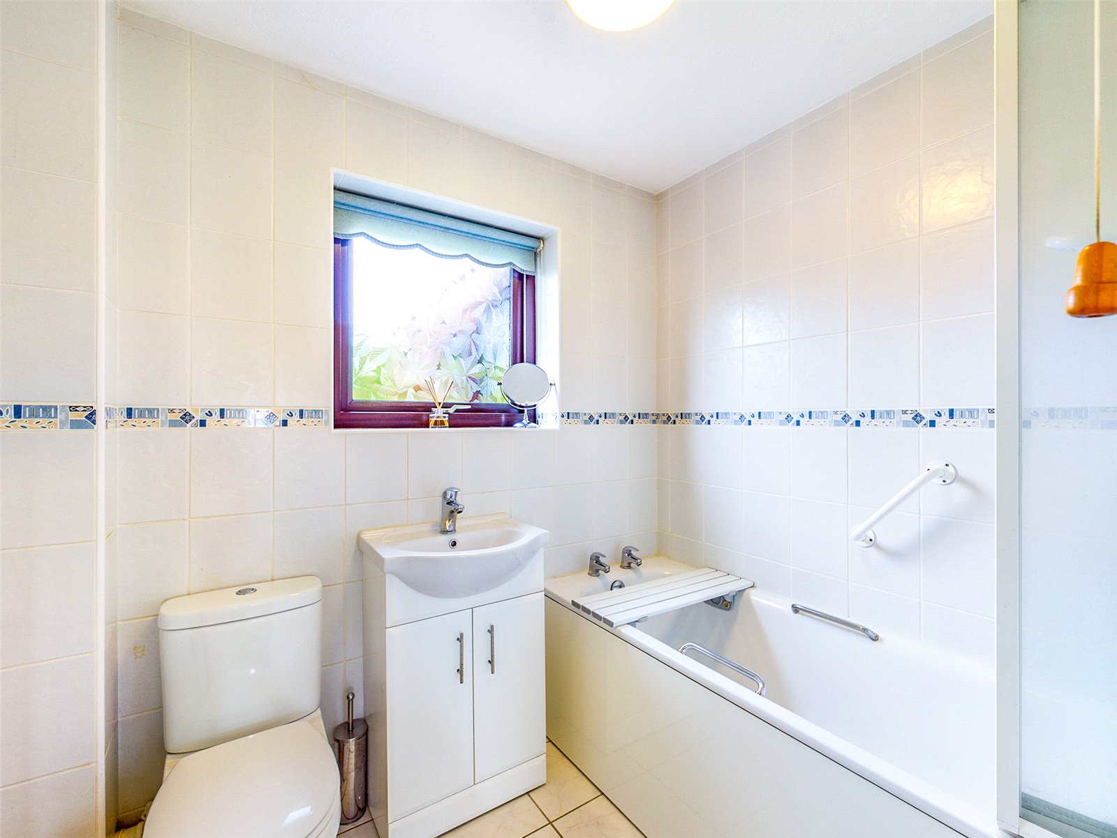 The bathroom comprises a white suite with WC, wash hand basin in vanity unit, panelled bath with a wall mounted electric shower, tiled walls and floor, and an obscured glazed window.