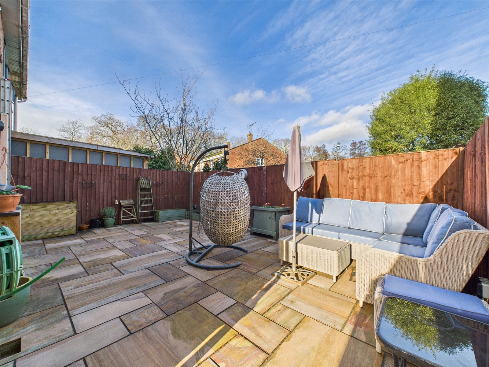 The rear garden offers a generous patio space, ideal for ease of maintenance and providing an ideal spot for alfresco dining or relaxing.