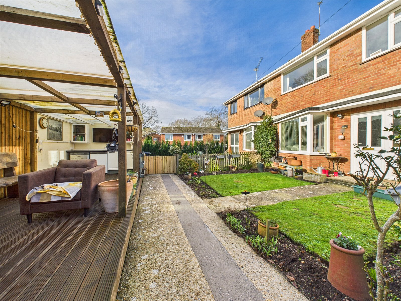 The front garden has an area of lawn along with a covered deck (terrace) with power & light. This could fit a range of uses from entertaining space to home office potential.