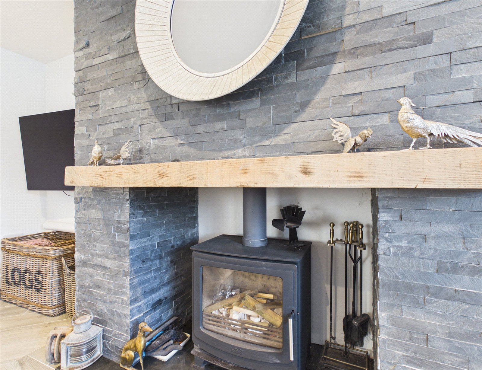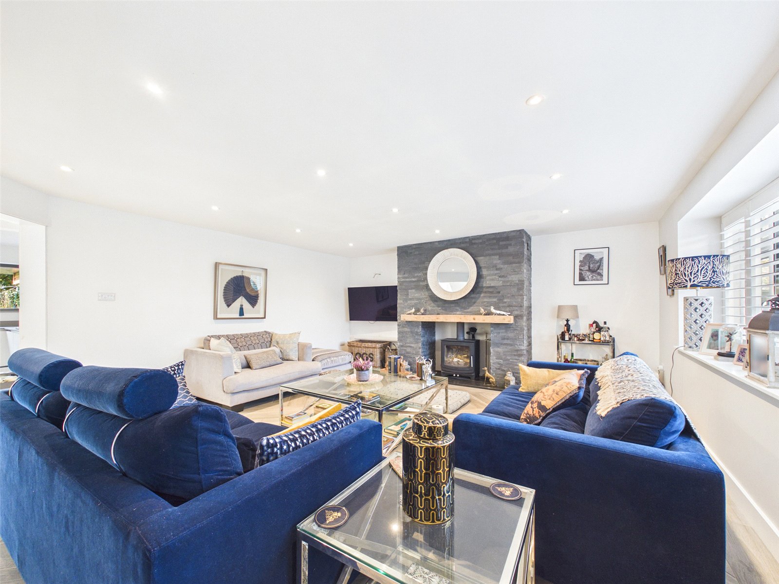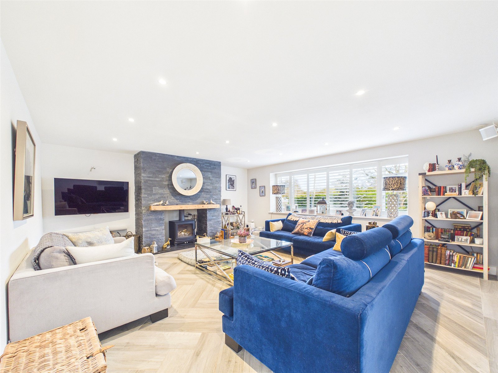 A large Living Room enjoys a large window to the front the hub of the home, a slate tiled fireplace with inset wood burning stove and herringbone flooring.