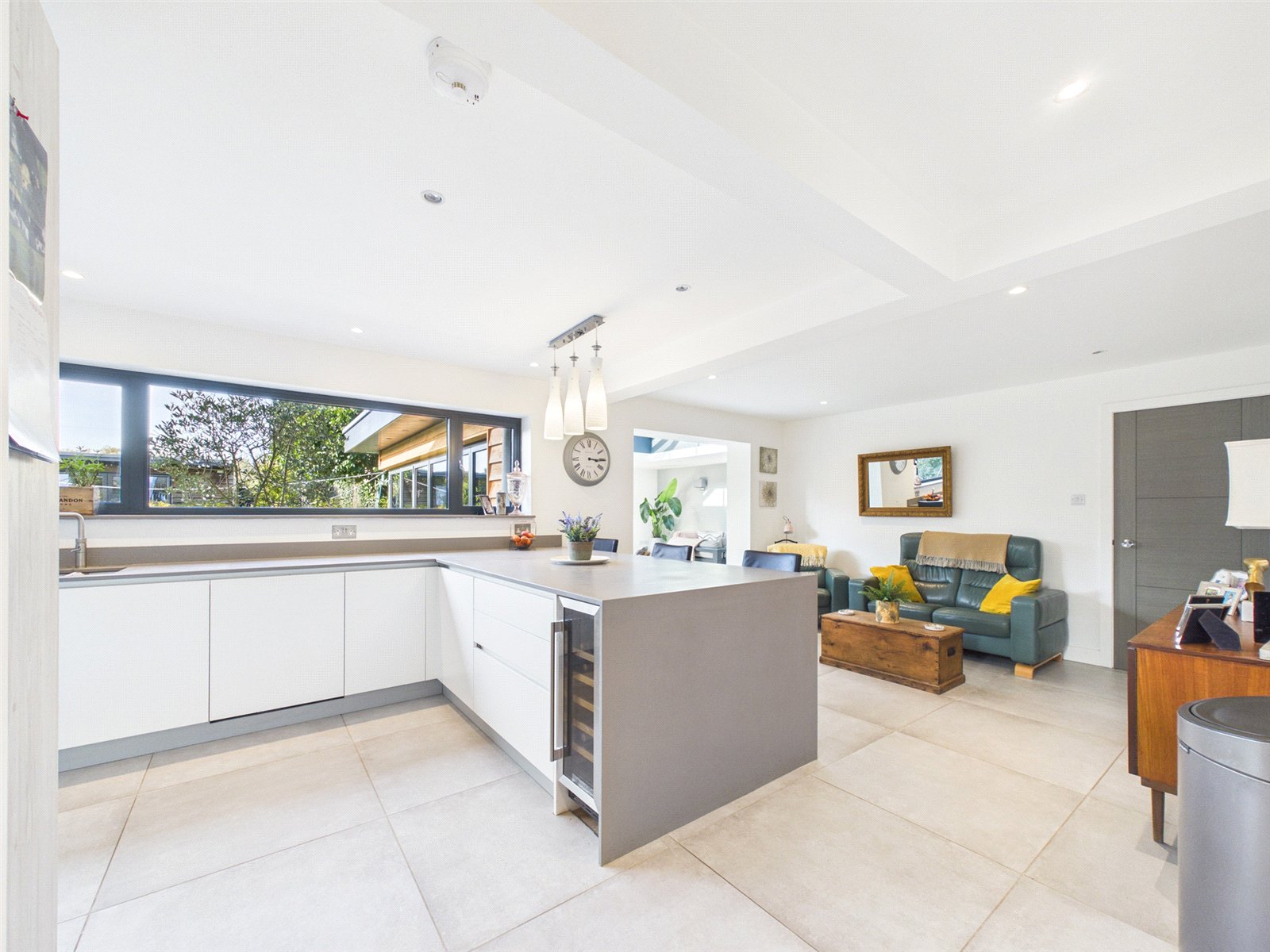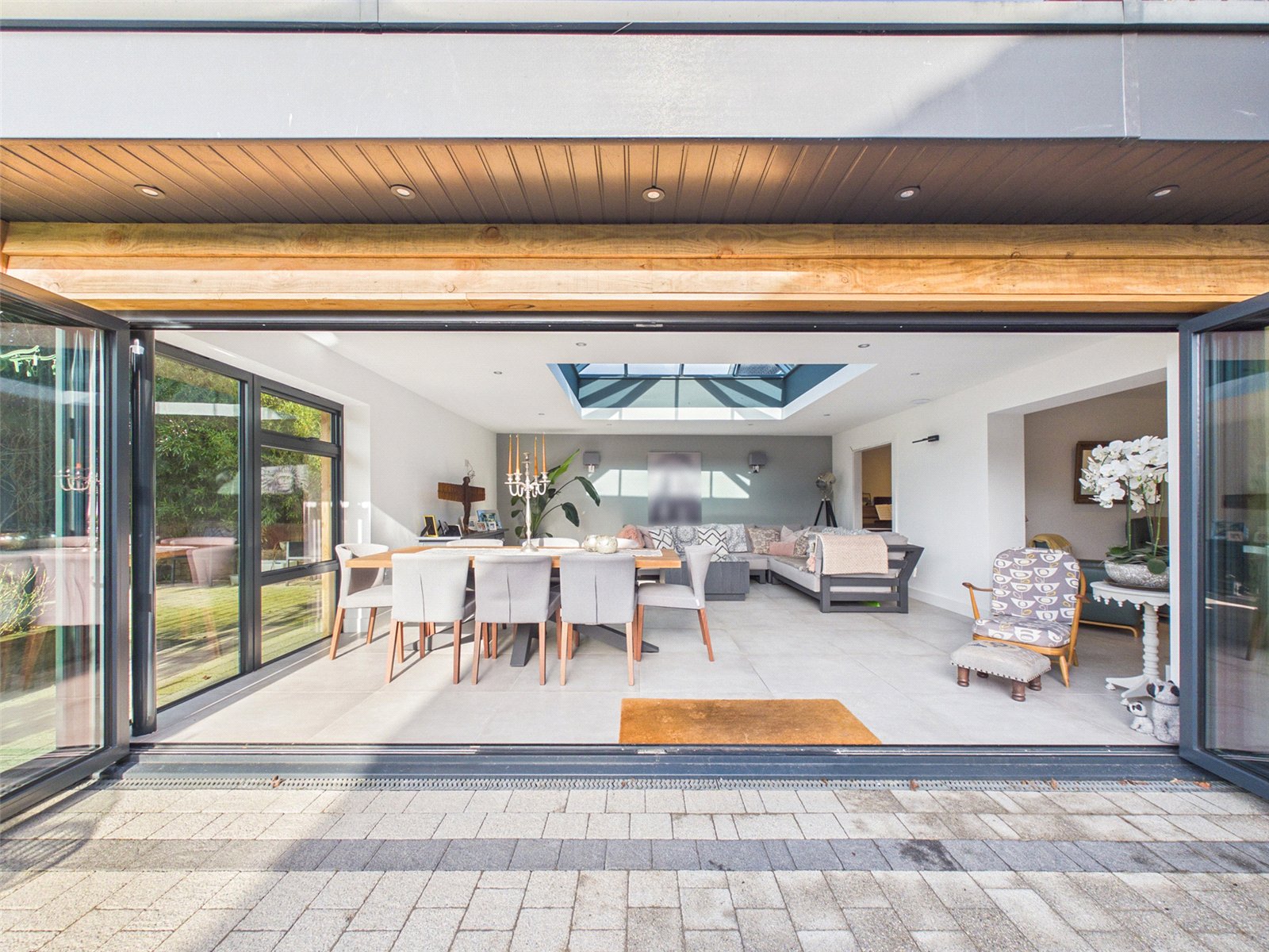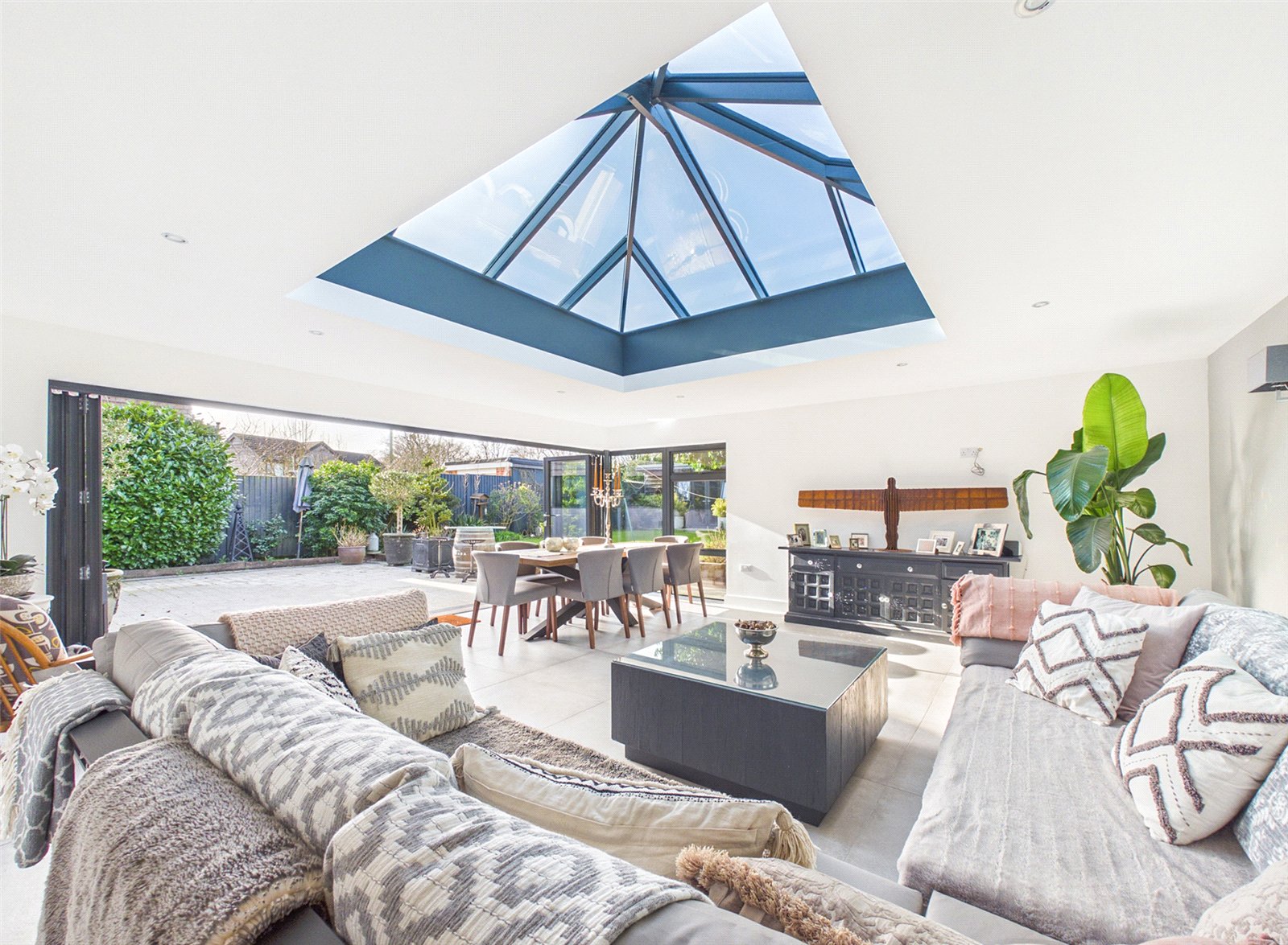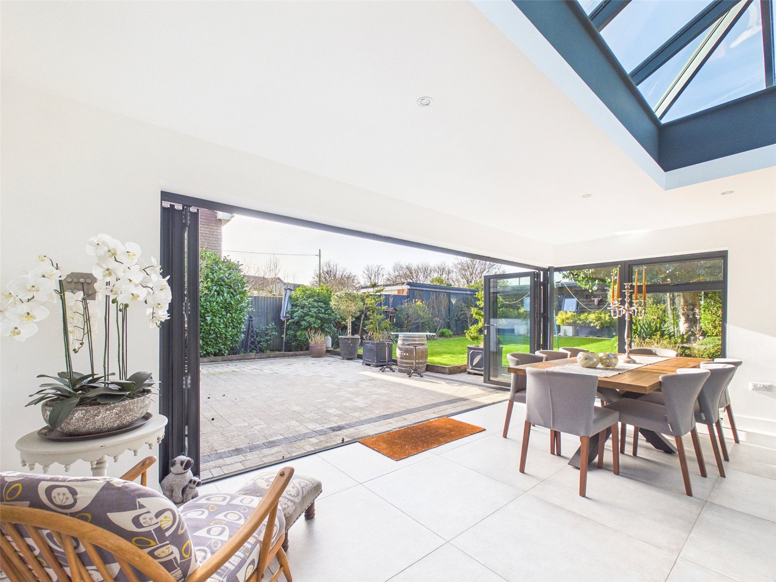 An opening leads to a vast Living Area with roof light, large bifold doors to the Patio and tiled flooring.