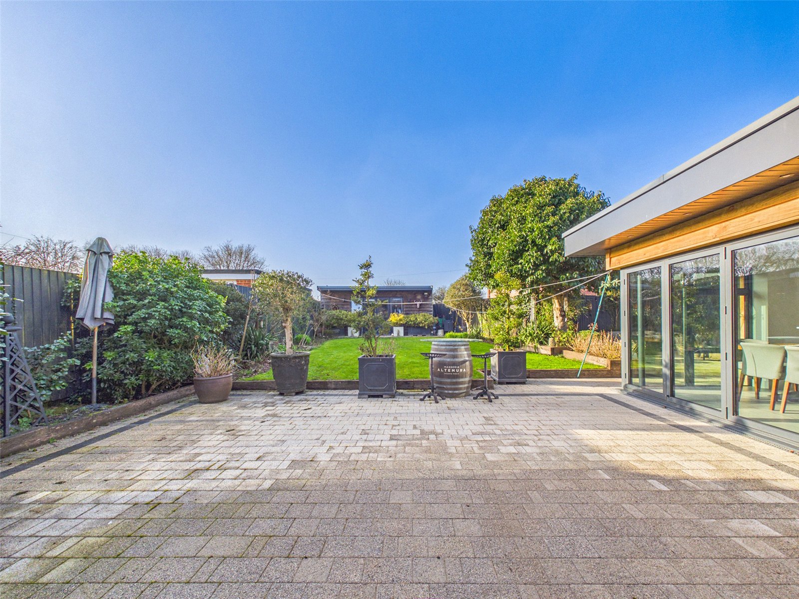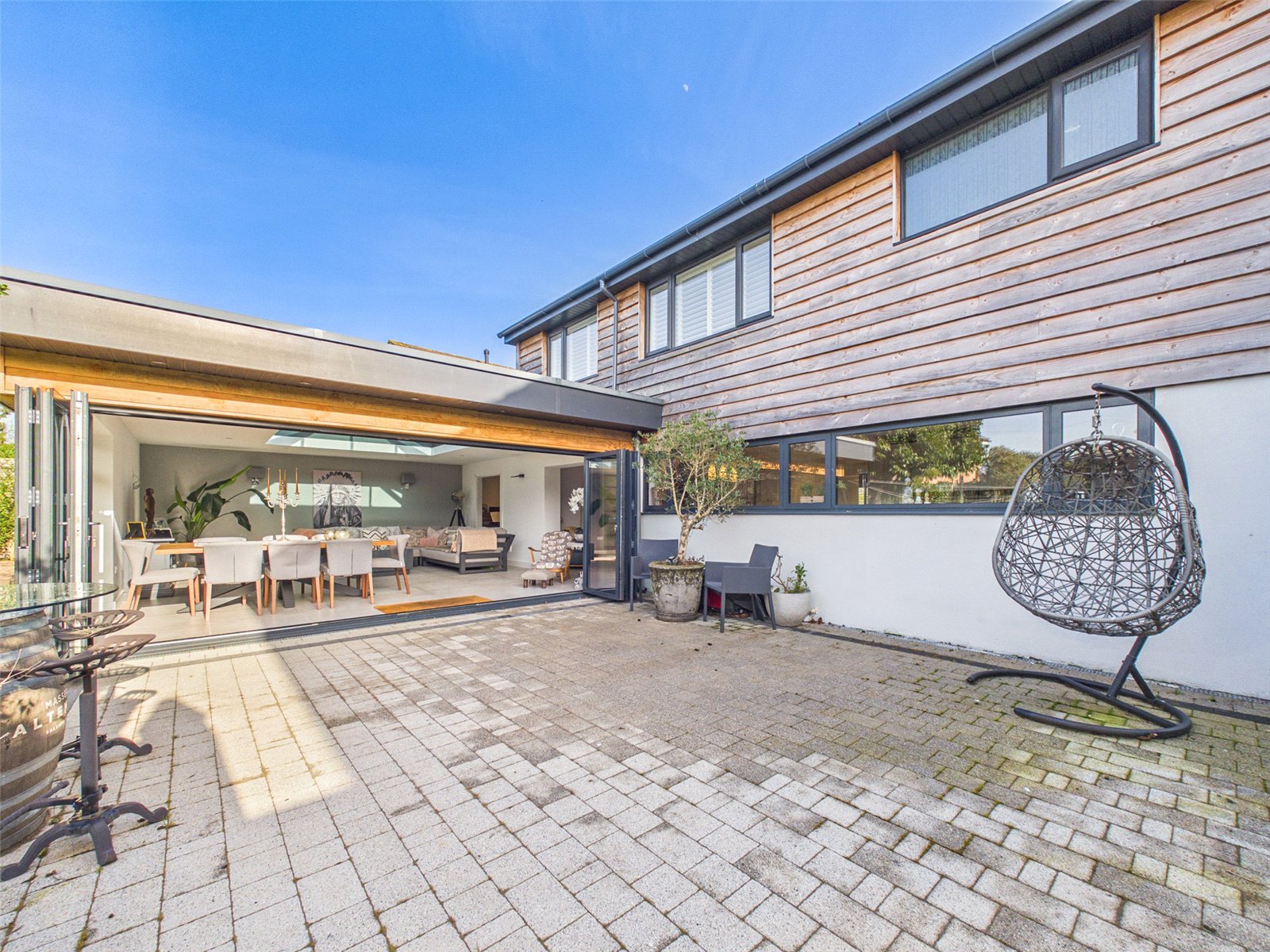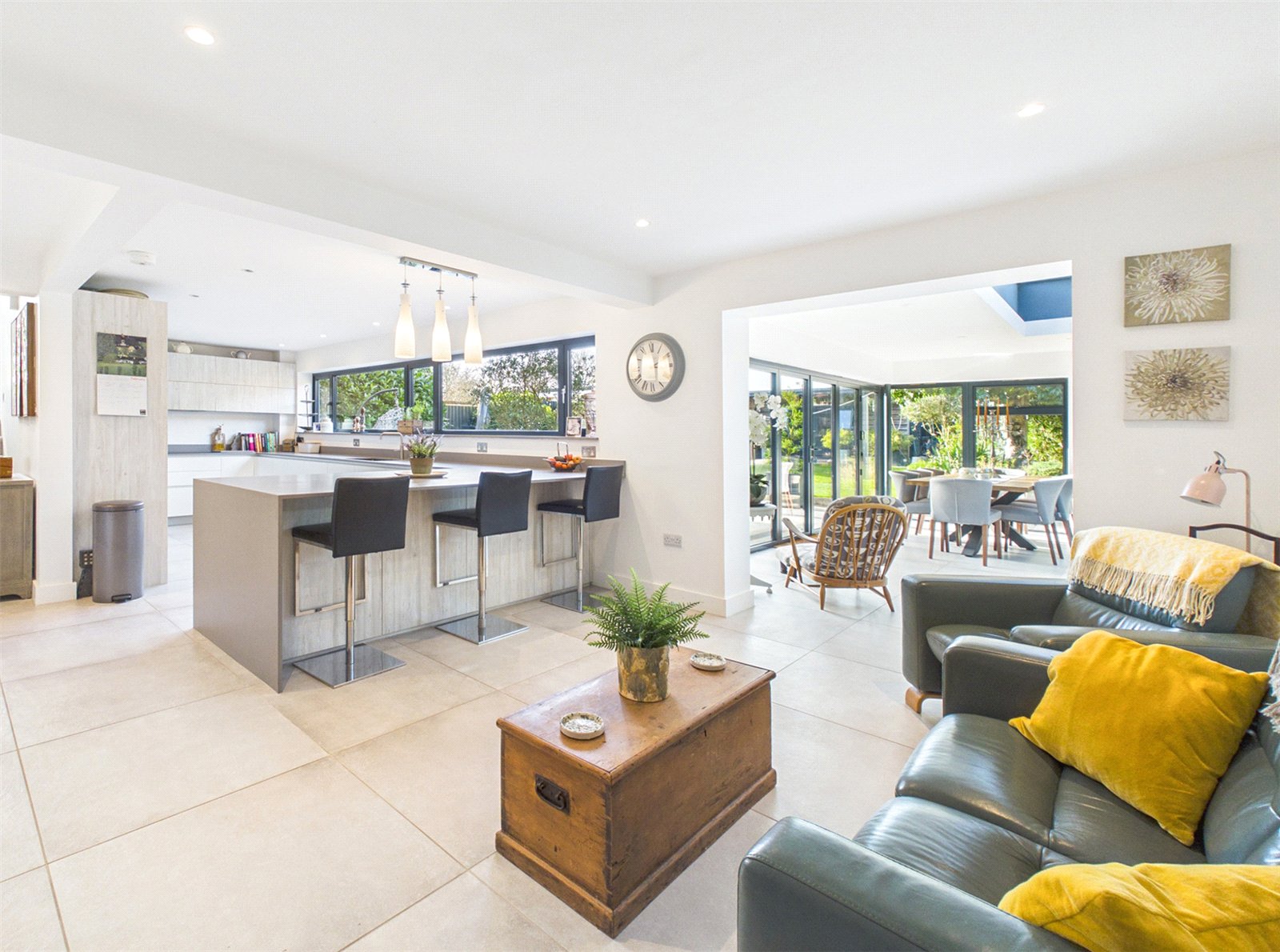 An opening leads to a vast Living Area with roof light, large bifold doors to the Patio and tiled flooring.