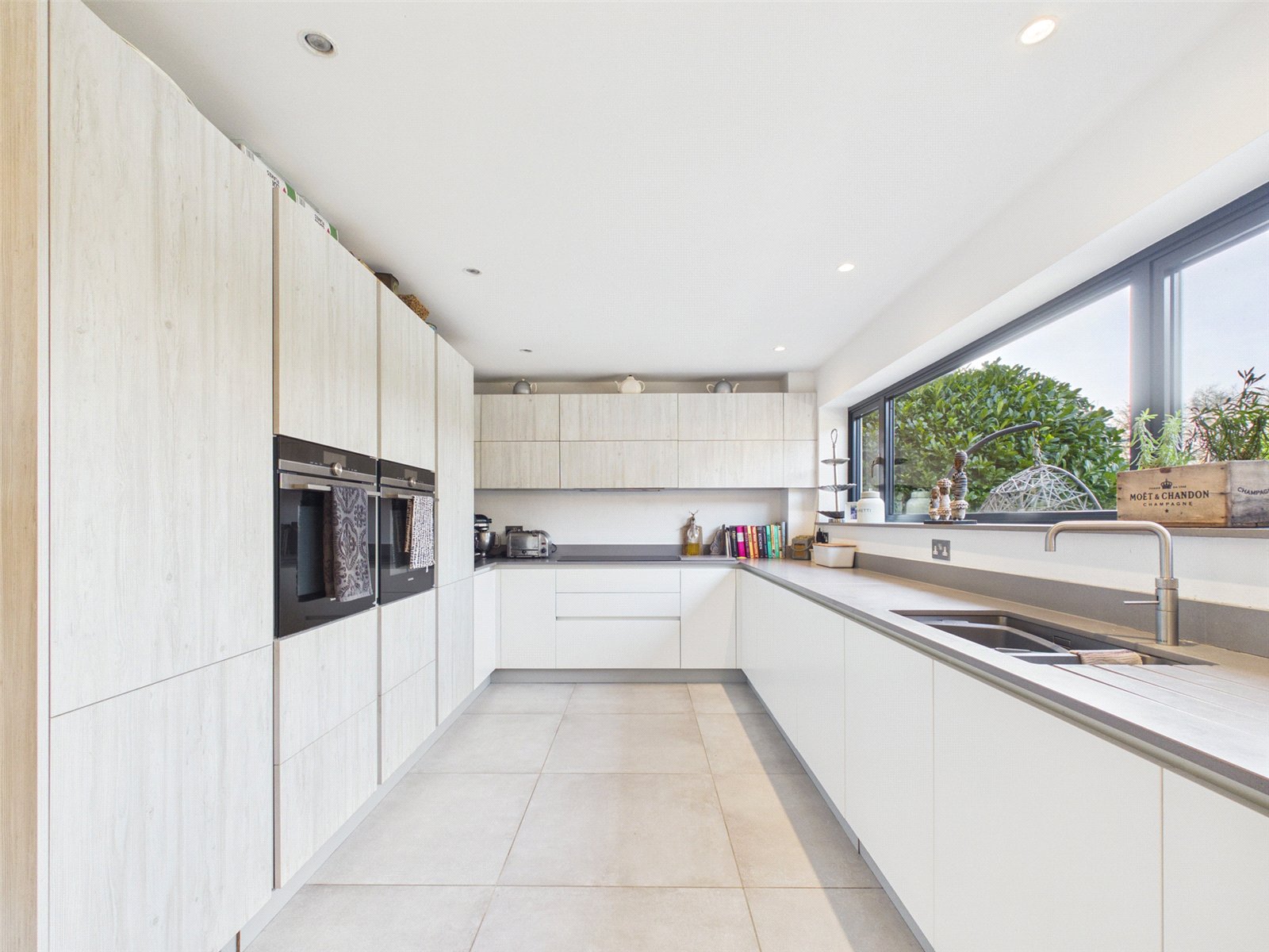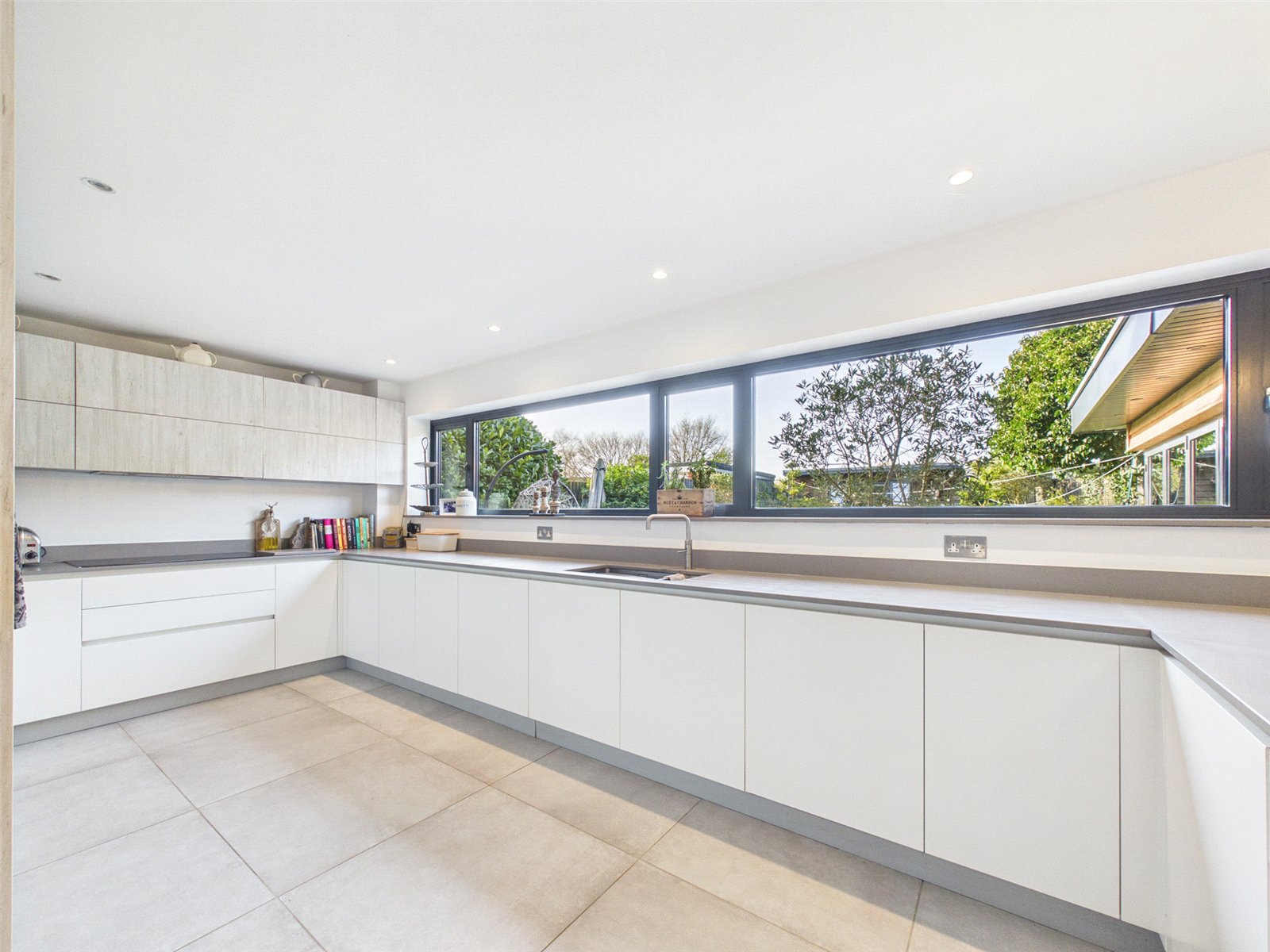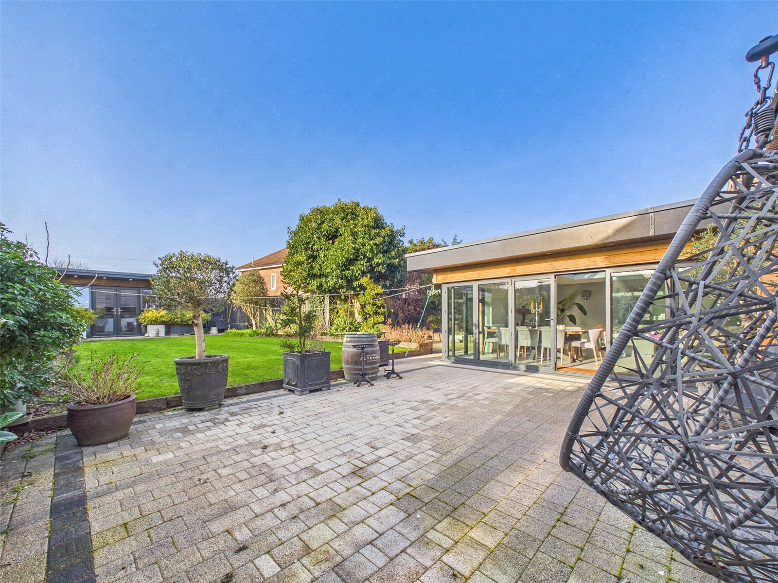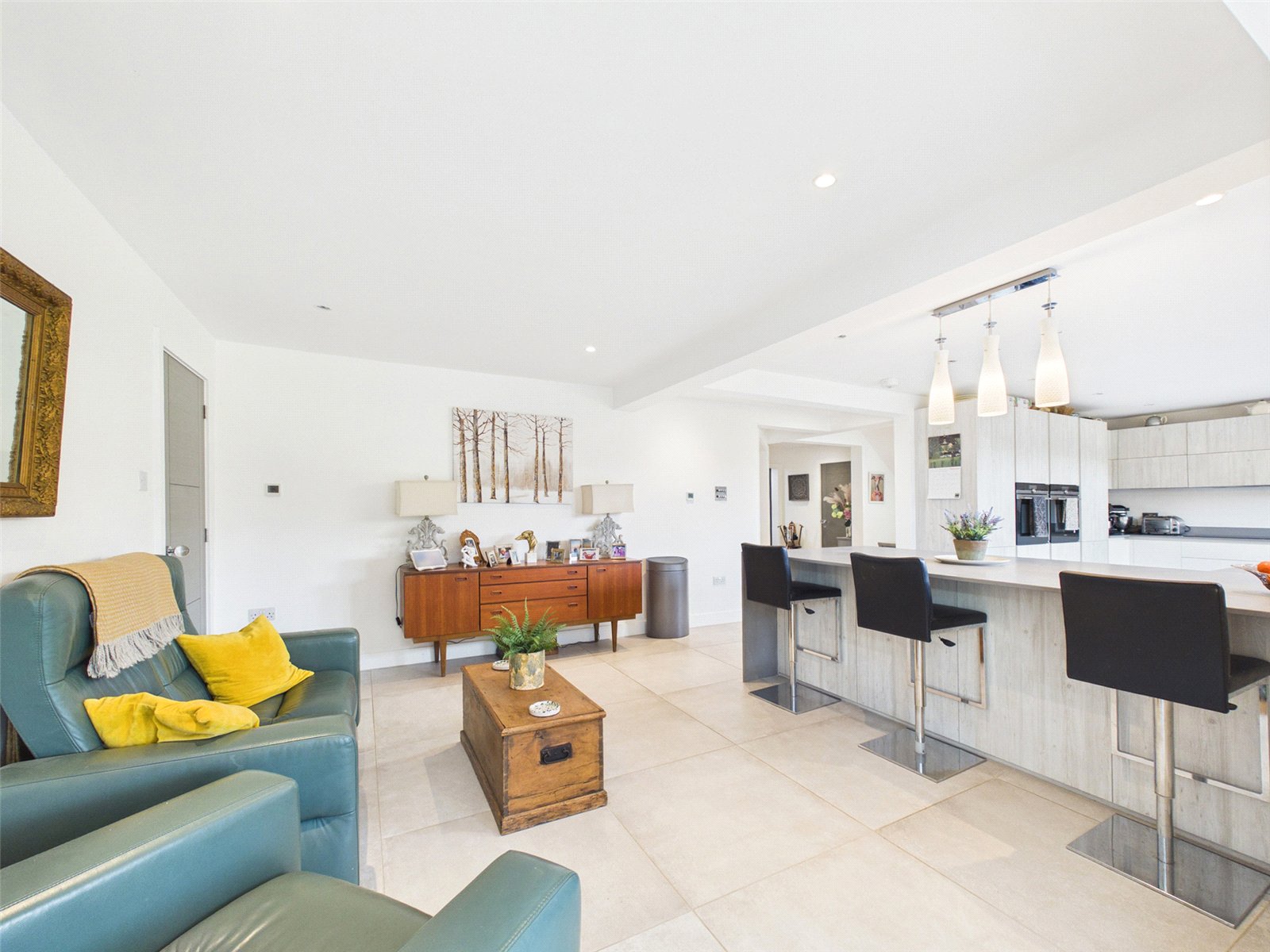 An opening leads to a vast Living Area with roof light, large bifold doors to the Patio and tiled flooring.