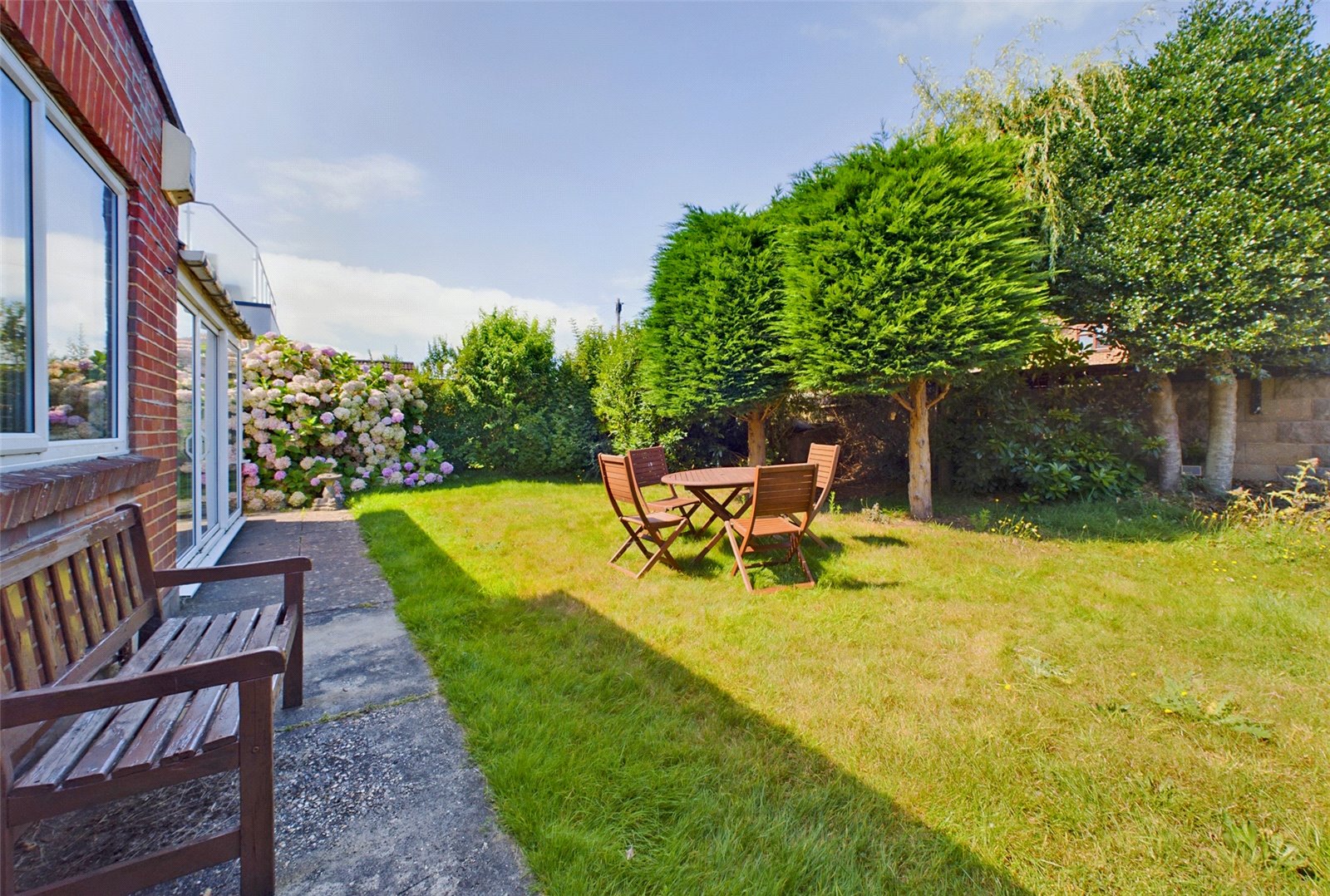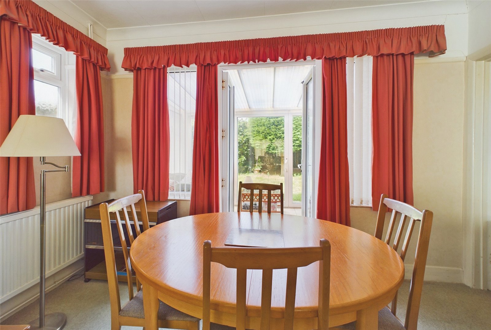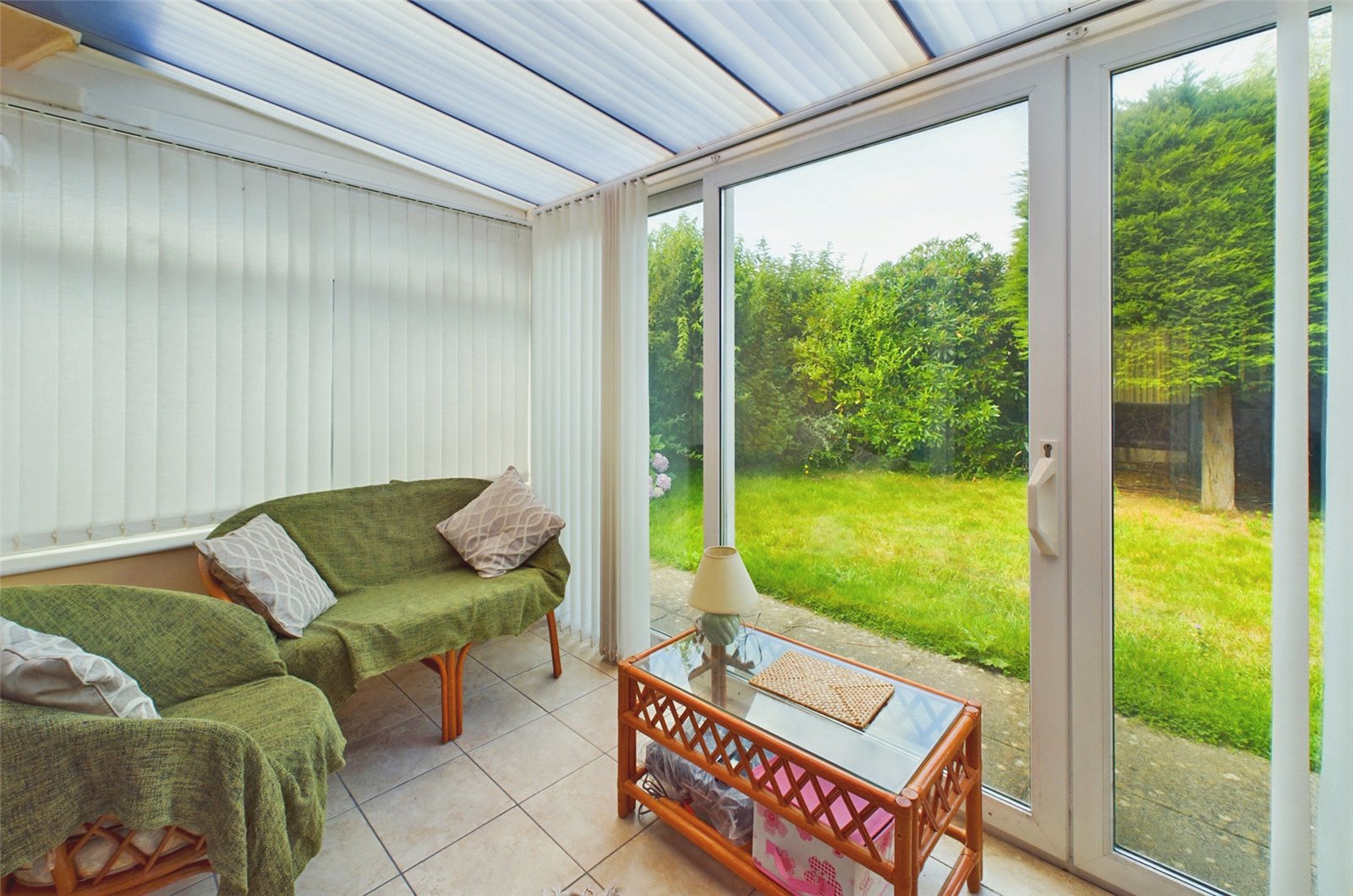 The sun room has a sliding door giving garden access, a polycarbonate roof, and windows to the side and rear, making a pleasant seating area with a Westerly aspect over the gardens.