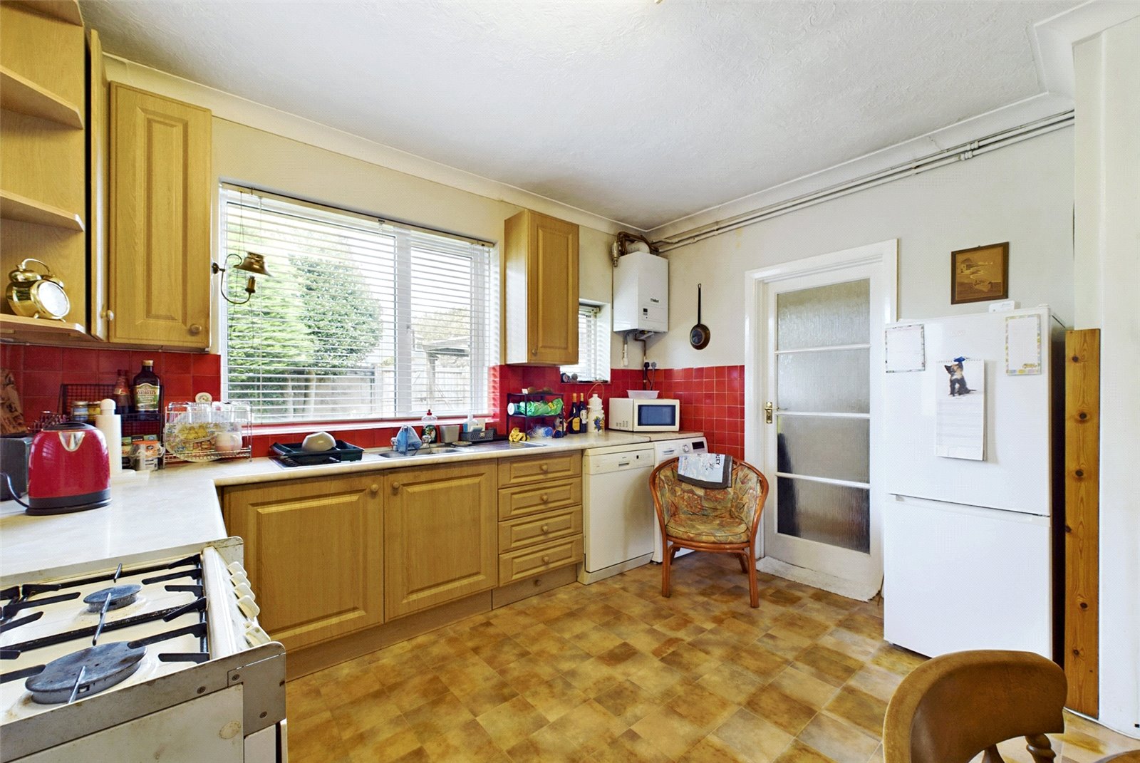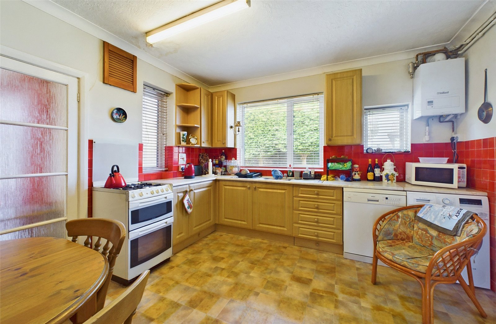 There is a separate kitchen which overlooks the rear gardens and offers room for a breakfast table. This comes fitted with a range of eye and base level cupboards with space provided for a washing machine, dishwasher, fridge/freezer and a freestanding cooker. It also houses the relatively modern Vaillant gas boiler.