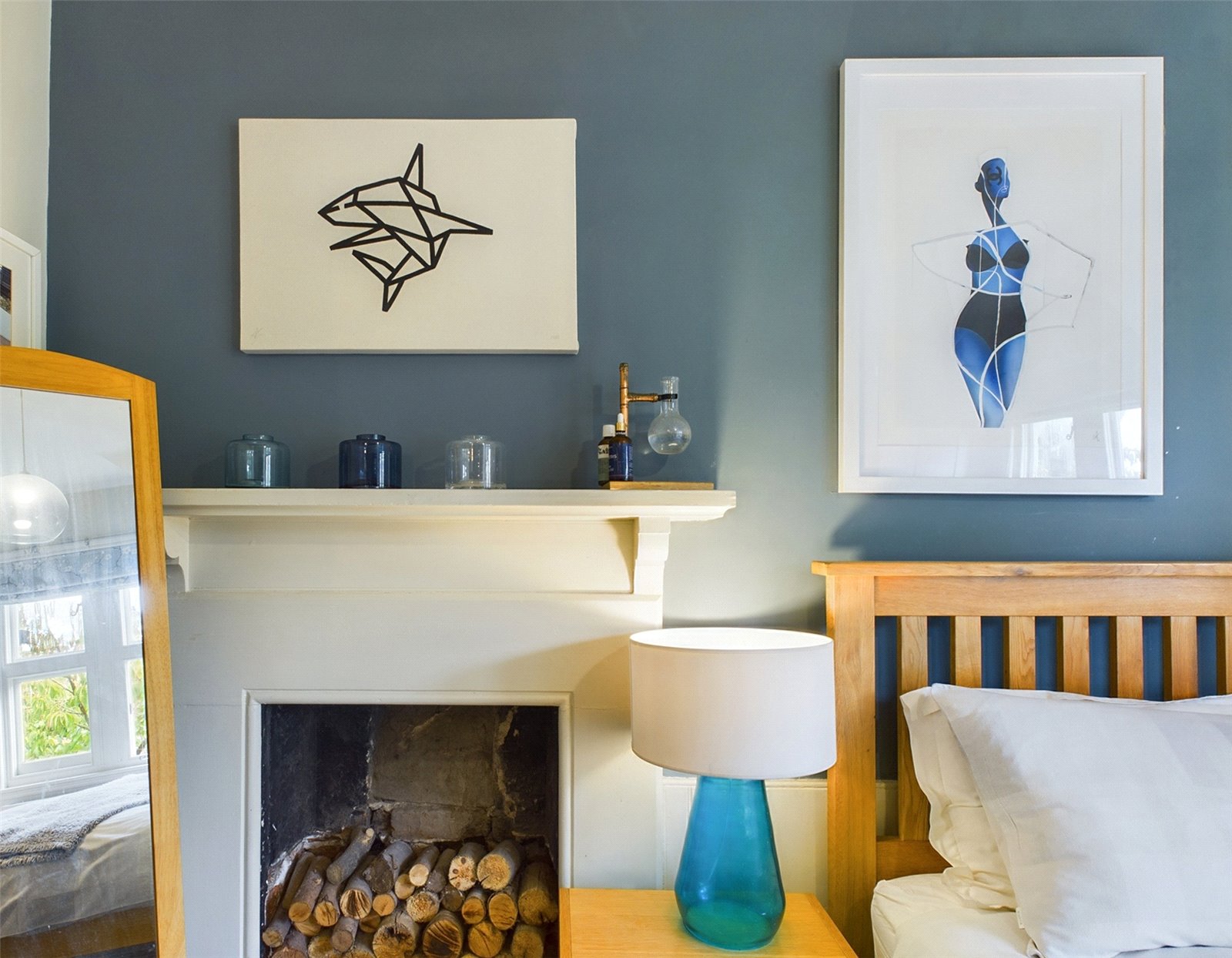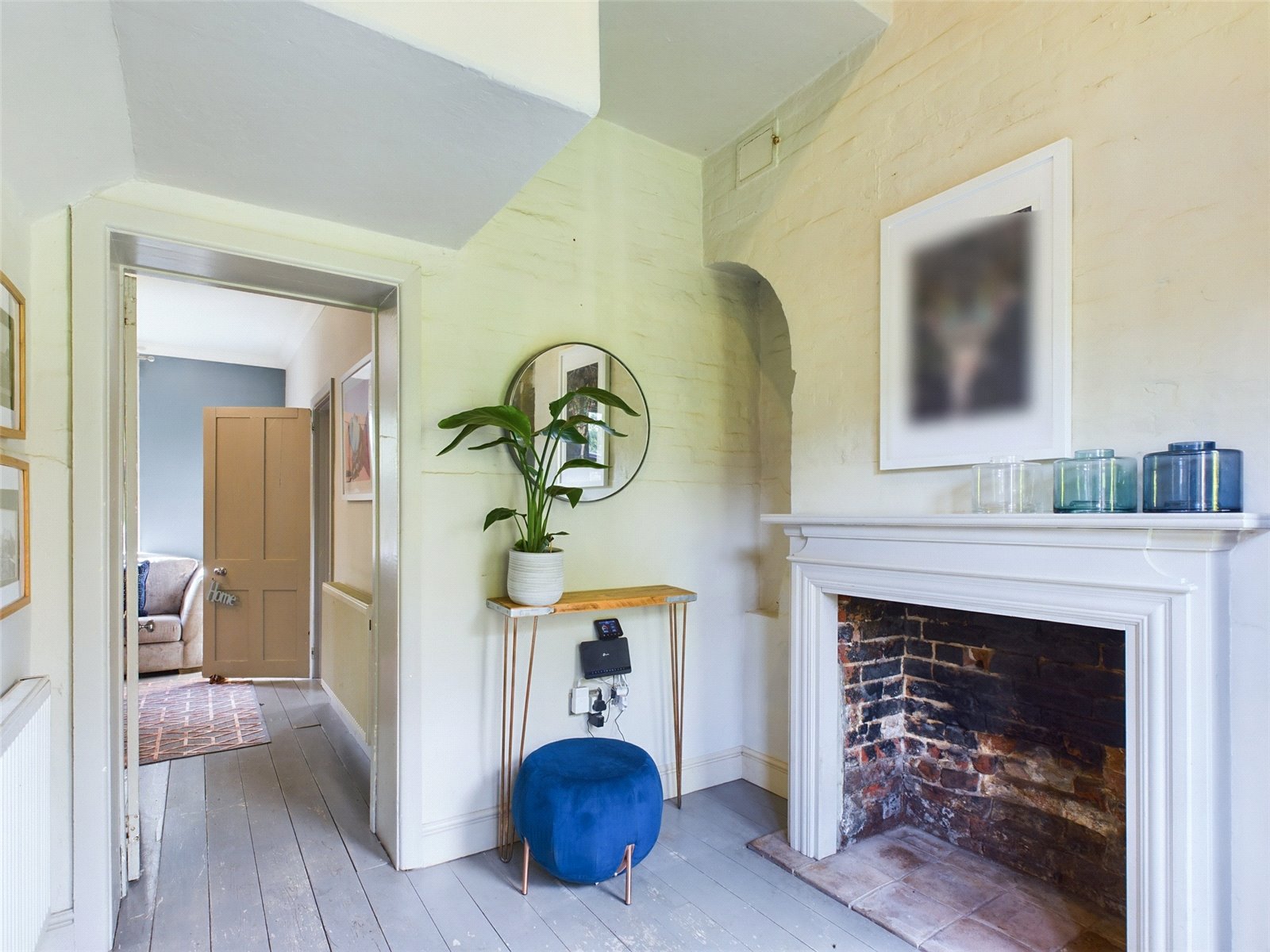 A spacious Entrance Hall with a useful Boot/Utility cupboard features exposed brickwork and a feature fireplace, along with painted wooden floorboards which extend throughout the ground floor.