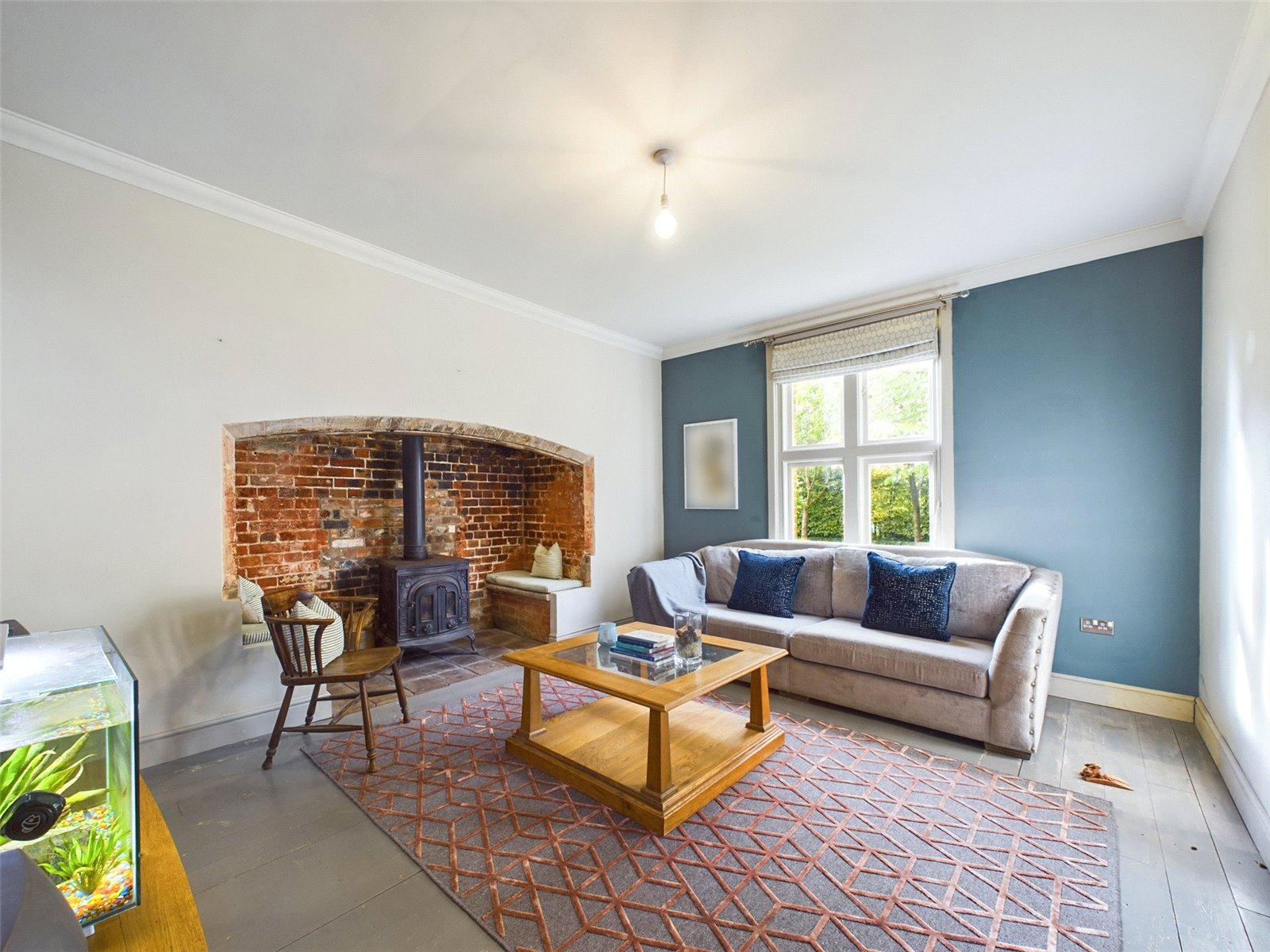 An impressive Living Room features a red brick Inglenook fireplace with an inset wood burning stove with seating either side and an original inset bread oven.