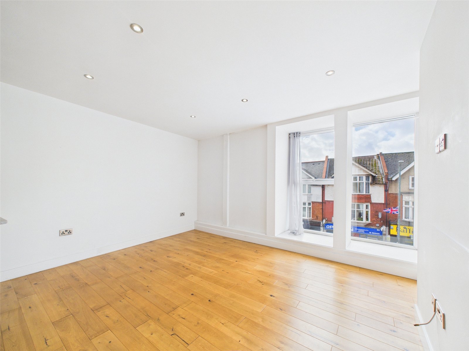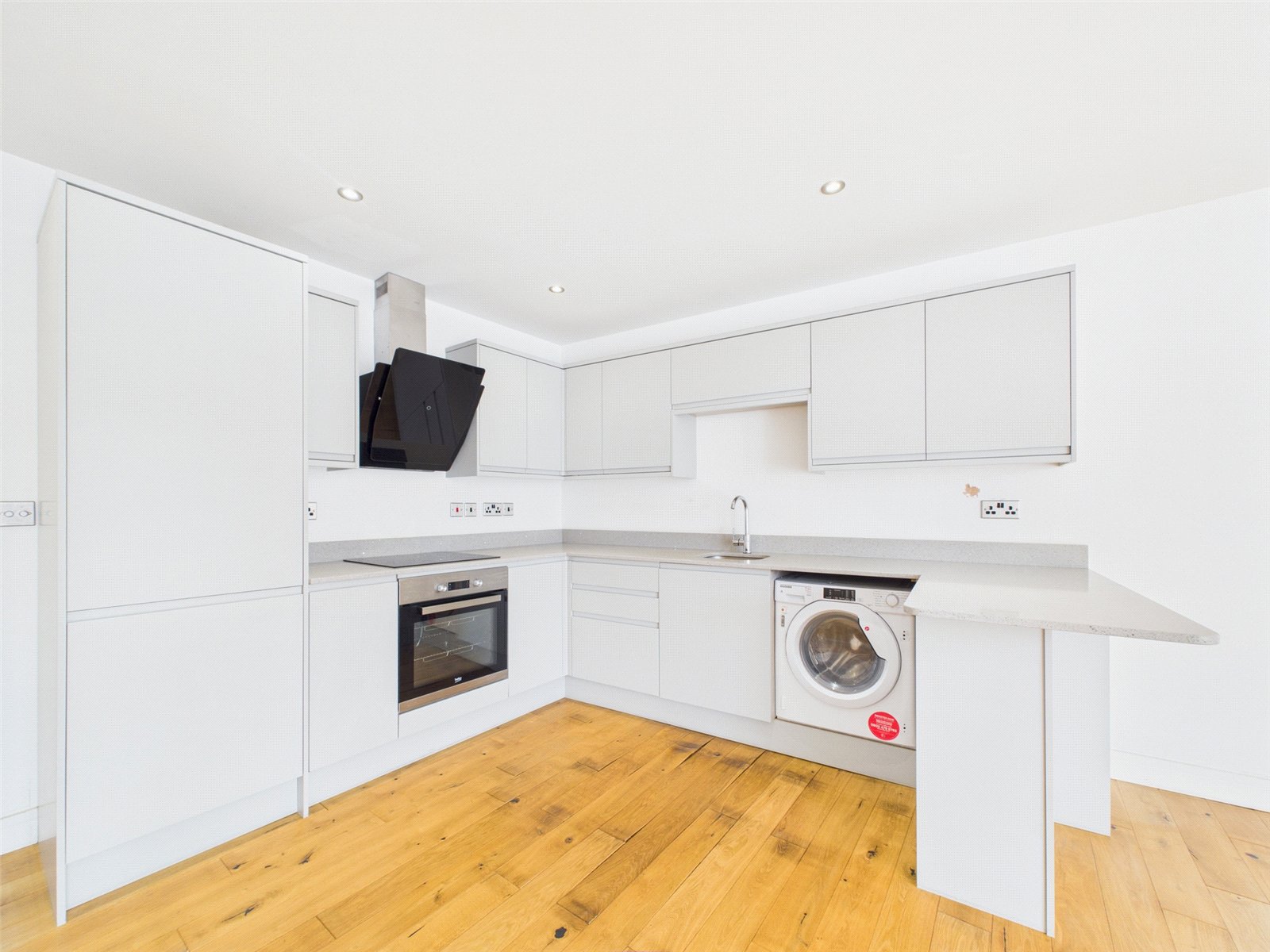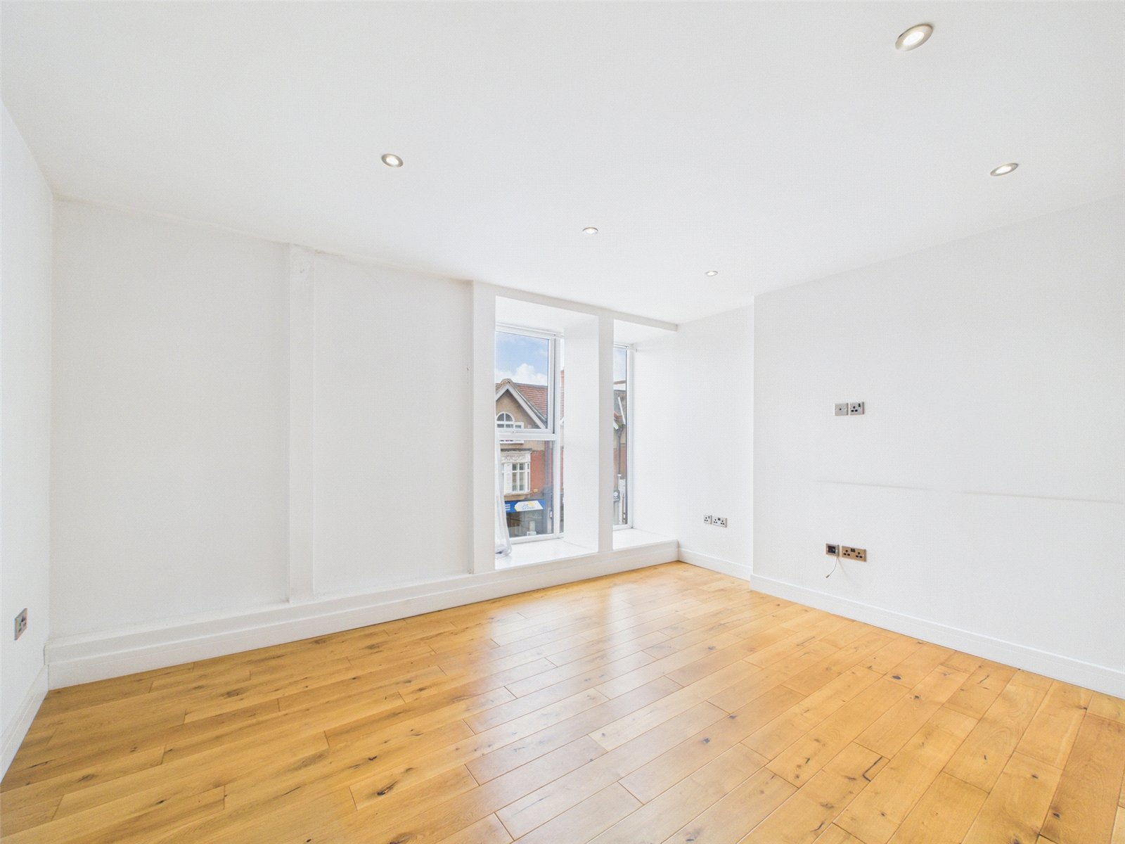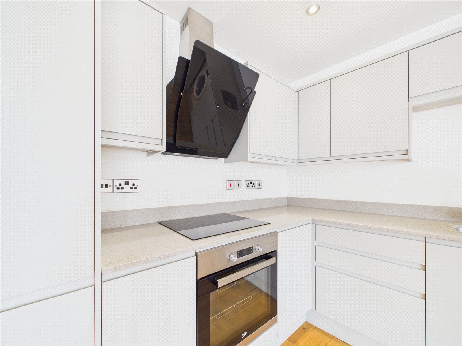 The open plan living space overlooks Southbourne Grove via large floor to ceiling windows. It is also nicely finished with a wooden floor to match the hall and features a Sleek kitchen area offering a good range of storage cupboards. There is an induction hob with an extractor hood above and matching oven below, as well as an integrated dishwasher and fridge freezer. A breakfast bar also offers space for barstools.