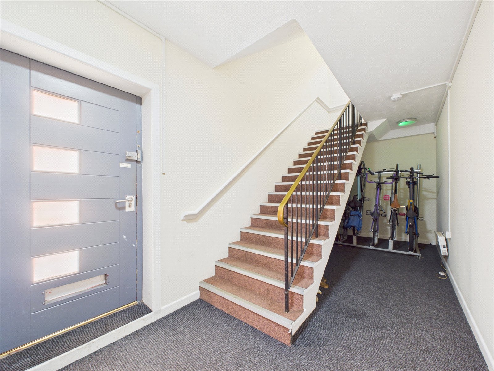 The building is entered through a communal front entrance, stairs then leading up to the second floor where communal hallways lead to the subject apartment.