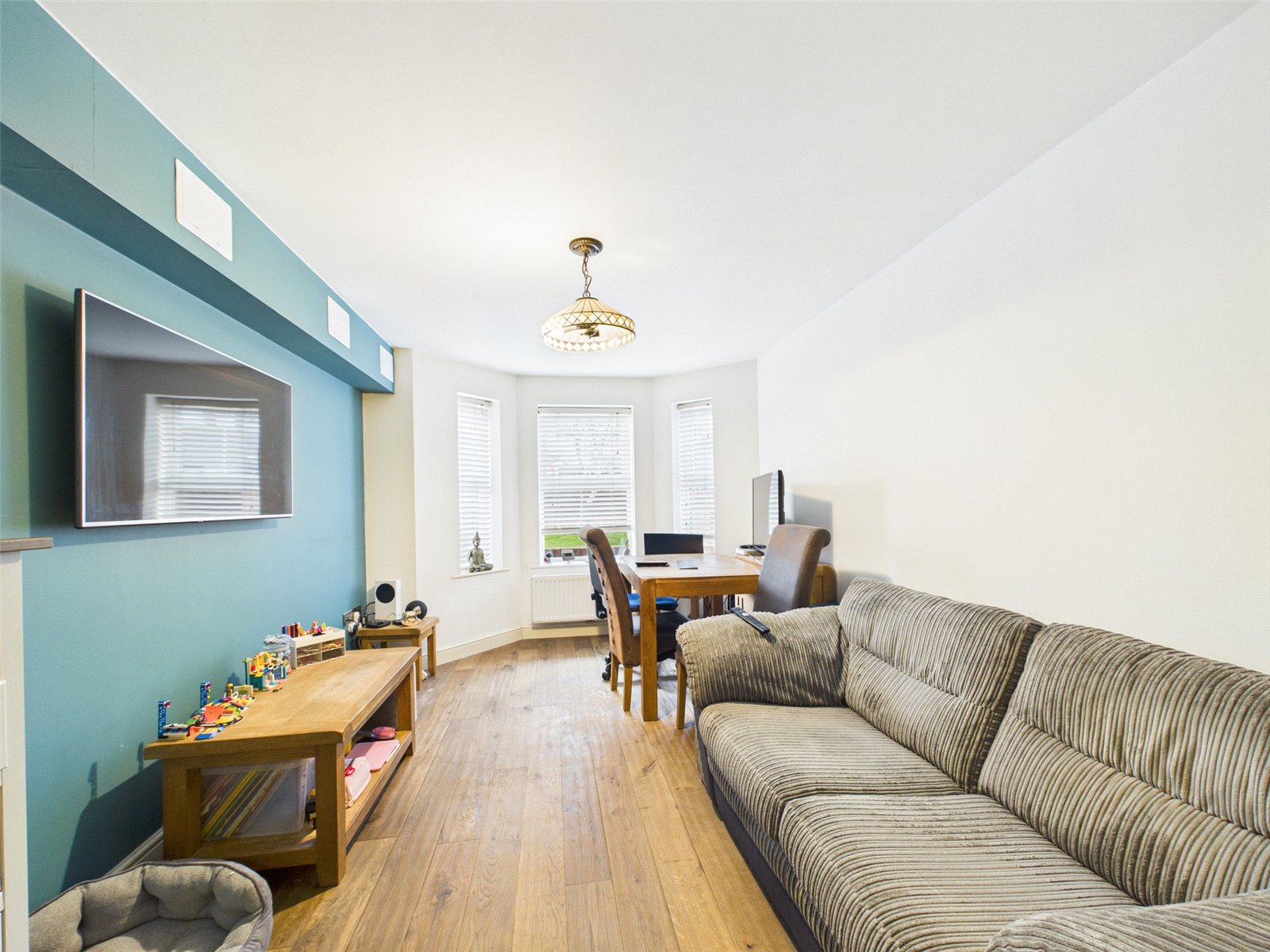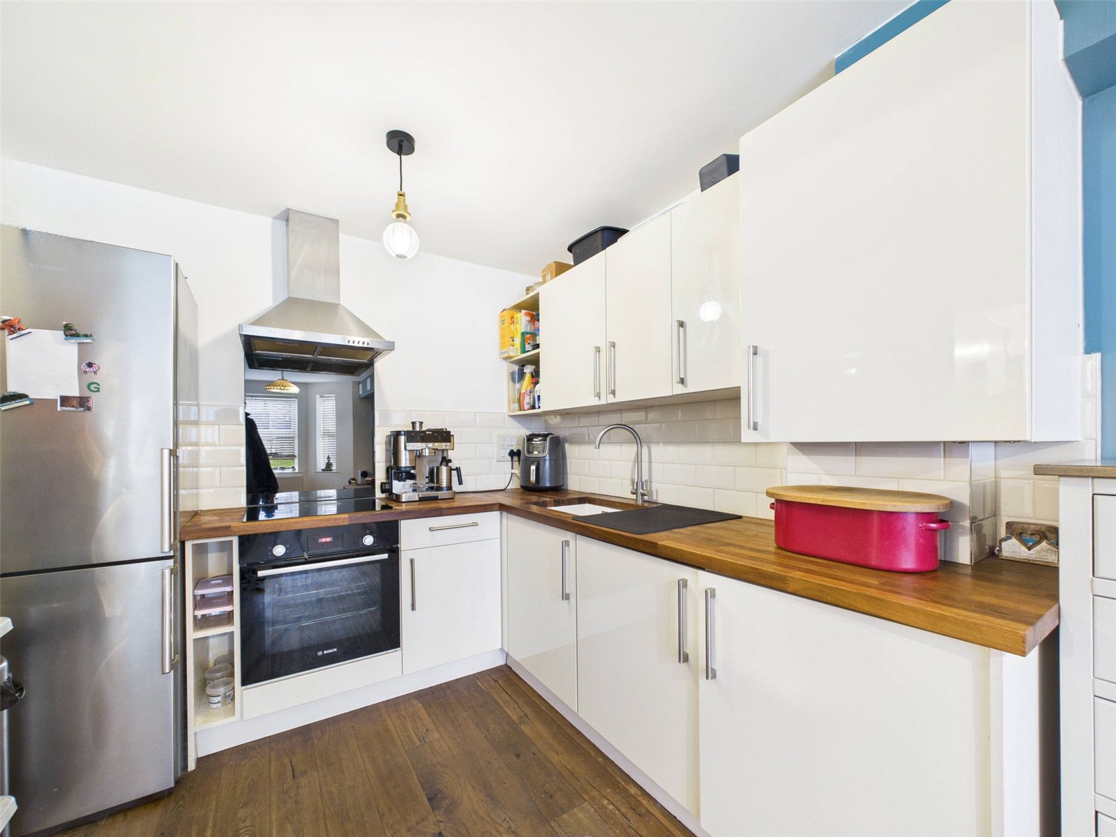 The open plan living space features a Southerly bay window overlooking the front of property and offers room for living and dining room furniture. There is a modern fitted kitchen finished with wooden worktops and metro tiled splashbacks. There is an electric hob with matching oven beneath and extractor hood over, an integrated washing machine, and space for a tall standing fridge/freezer.