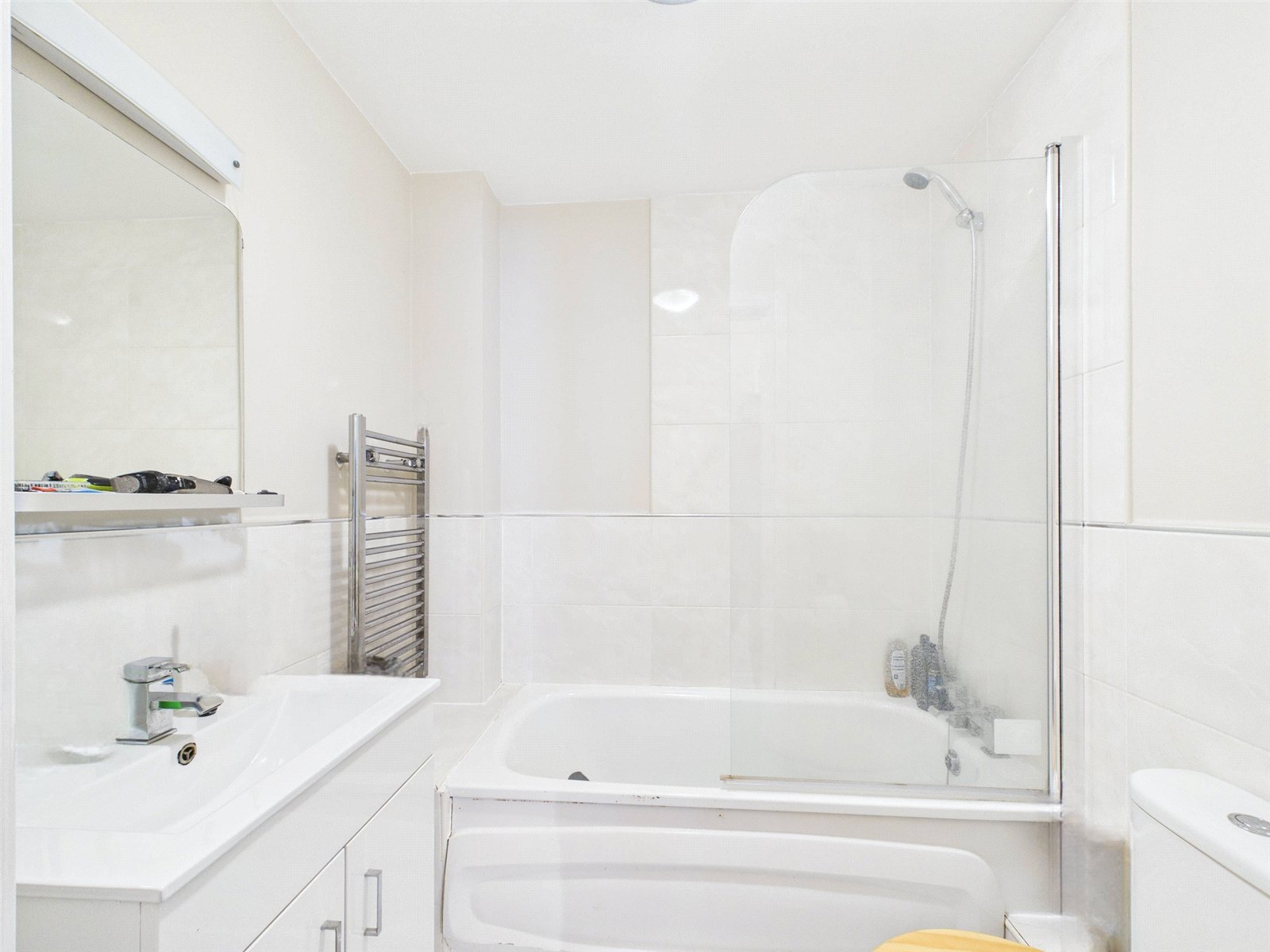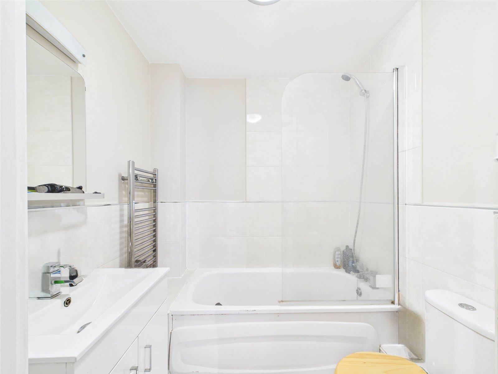 The bathroom has a full sized bath with a mixer shower over and shower screen to side, a hand wash basin with vanity cupboard beneath, and a low level wc. Walls are part tiled and there is a heated towel rail.