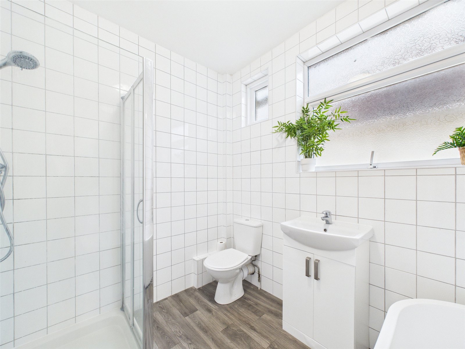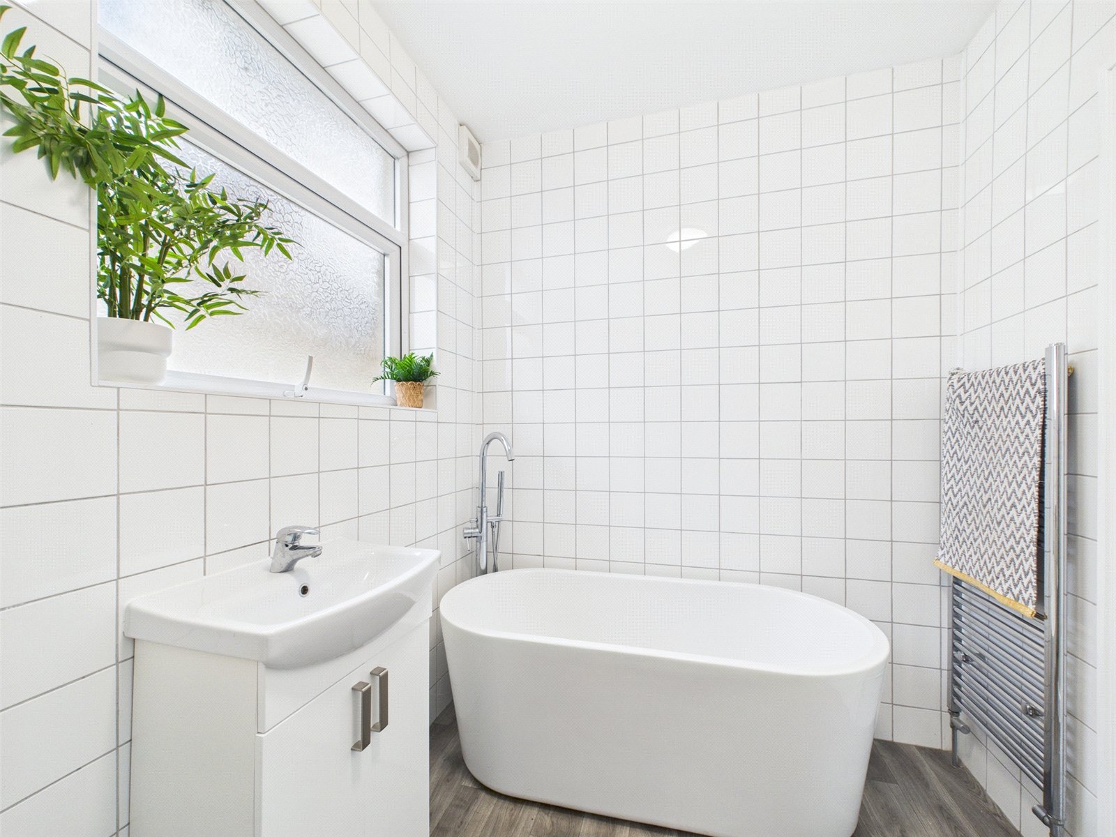 The spacious bathroom features a freestanding bath and a separate corner shower, as well as the low level wc, hand wash basin with vanity storage, and a heated towel rail.