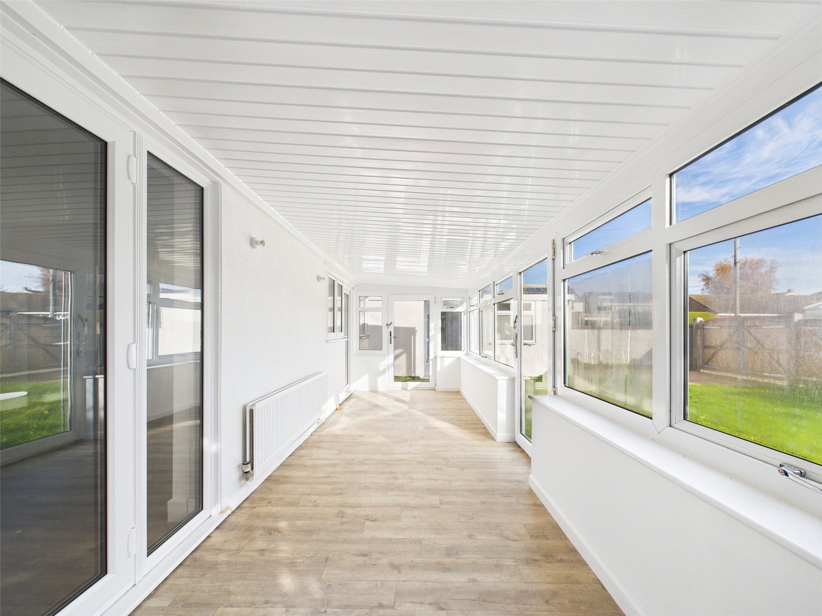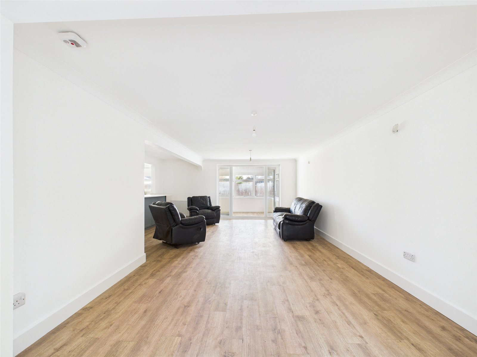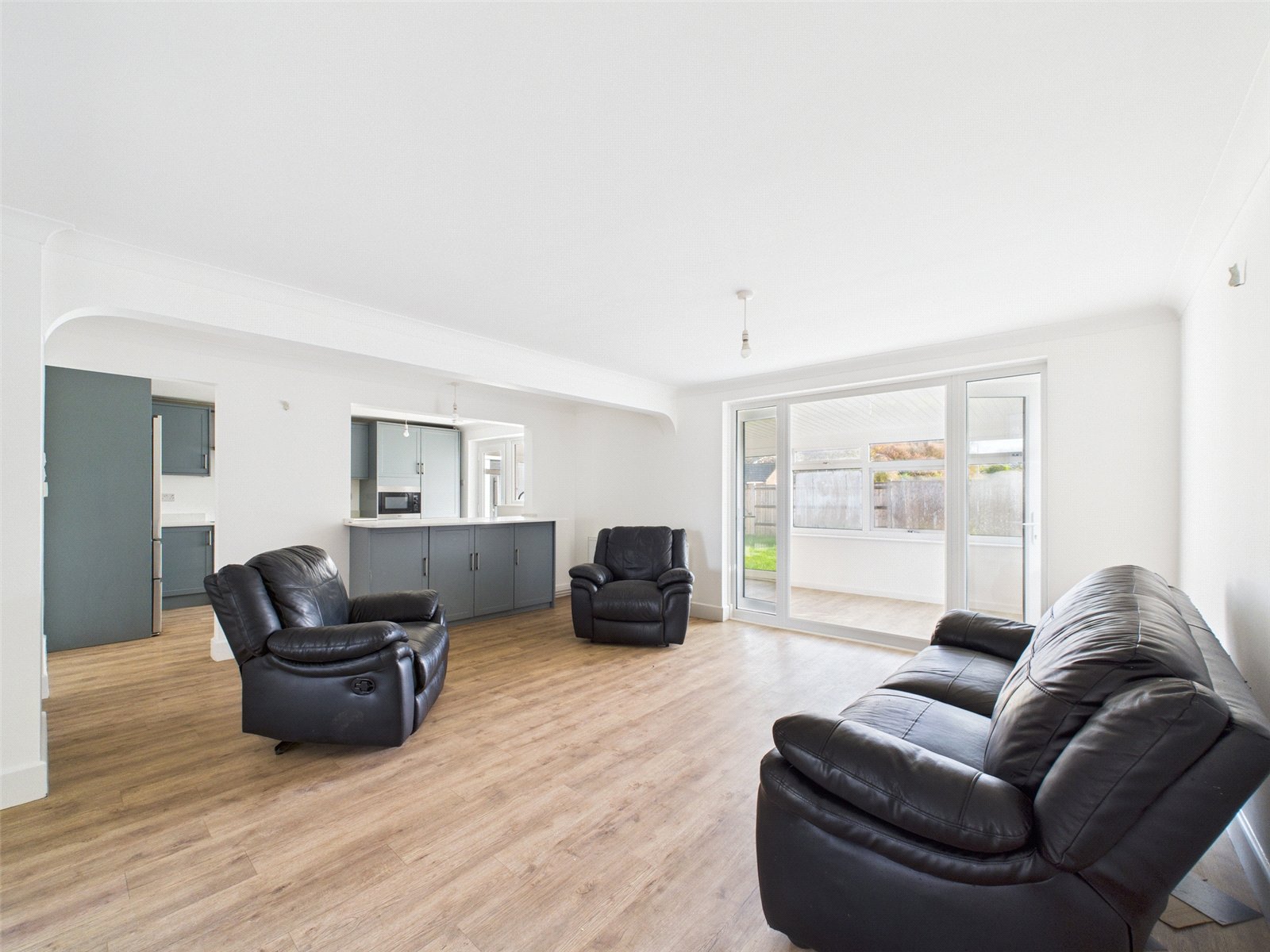 To the front, a large open-plan living area provides an inviting space for both relaxation and entertaining, with plenty of natural light and doors opening into a conservatory at the rear that overlooks the garden.