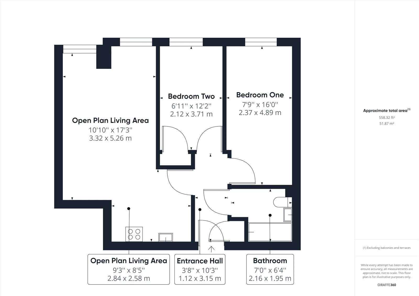The front door leads into the entrance hall which has a useful storage cupboard. A key feature of this property is the open plan living area which is of a good size with two large windows. The kitchen has a range of base and eye level units with integral appliances including cooker, hob, washer/dryer, dishwasher and fridge/freezer. This property has two bedrooms. Bedroom two has a large storage cupboard which houses the gas central heating boiler. The bathroom has a suite comprising wc, wash hand basin and bath with shower over.