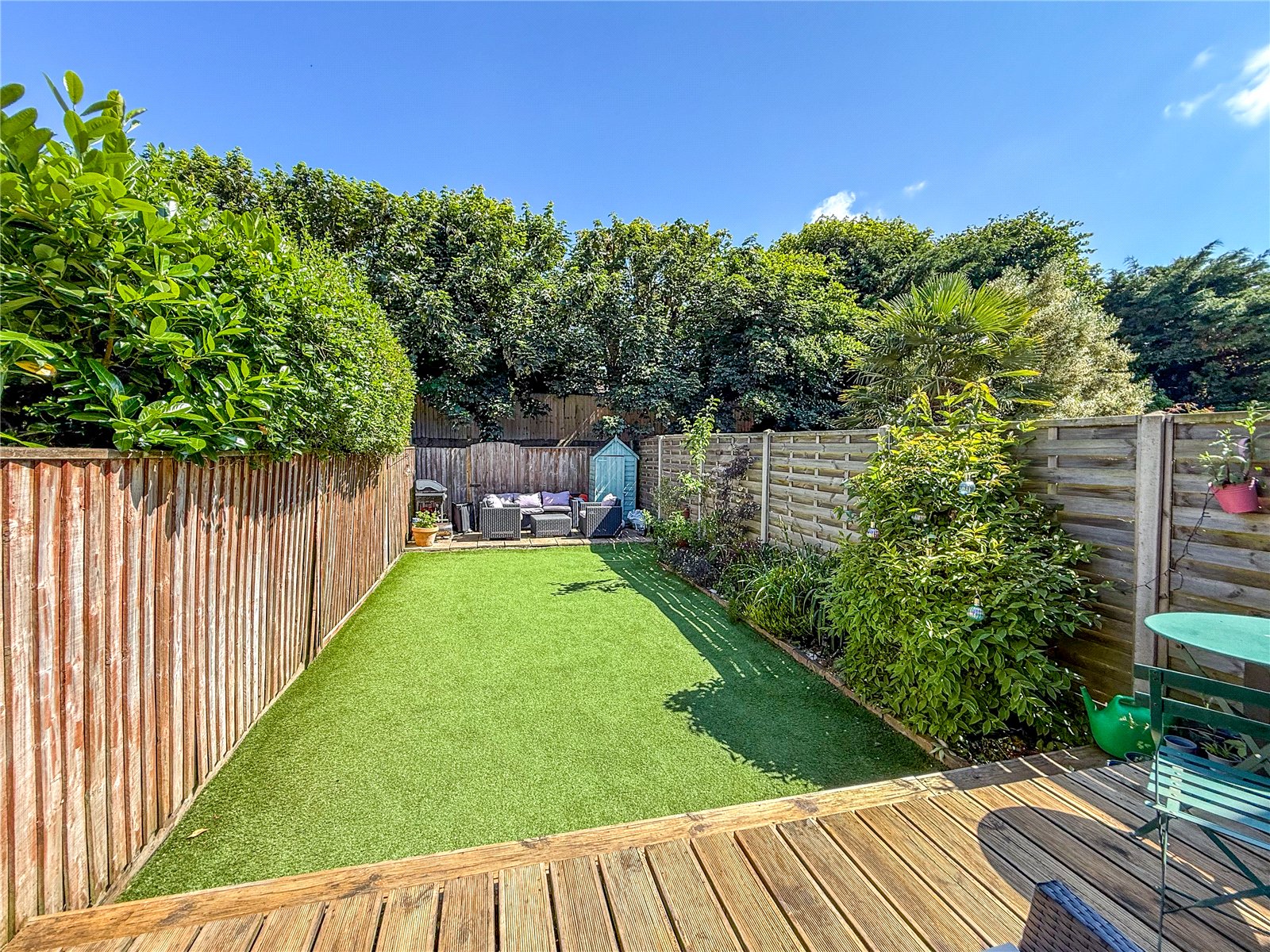 The rear garden features sections of patio, decking and artificial grass as well as a shrub and flower border. There is a gate at the end of the garden.