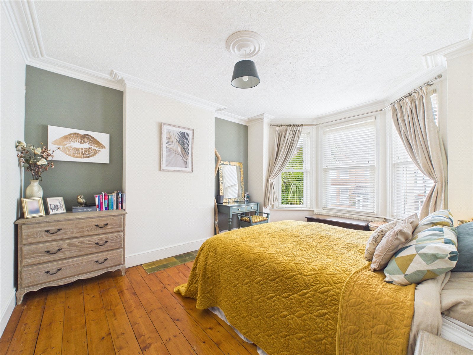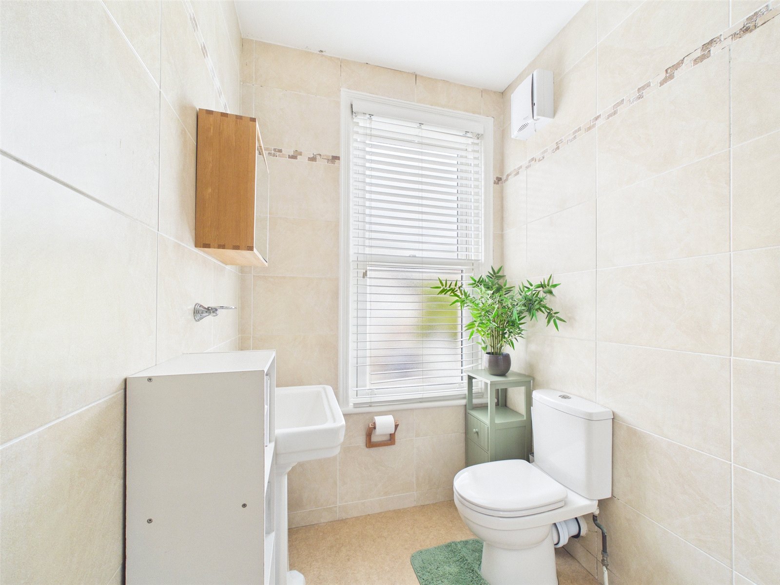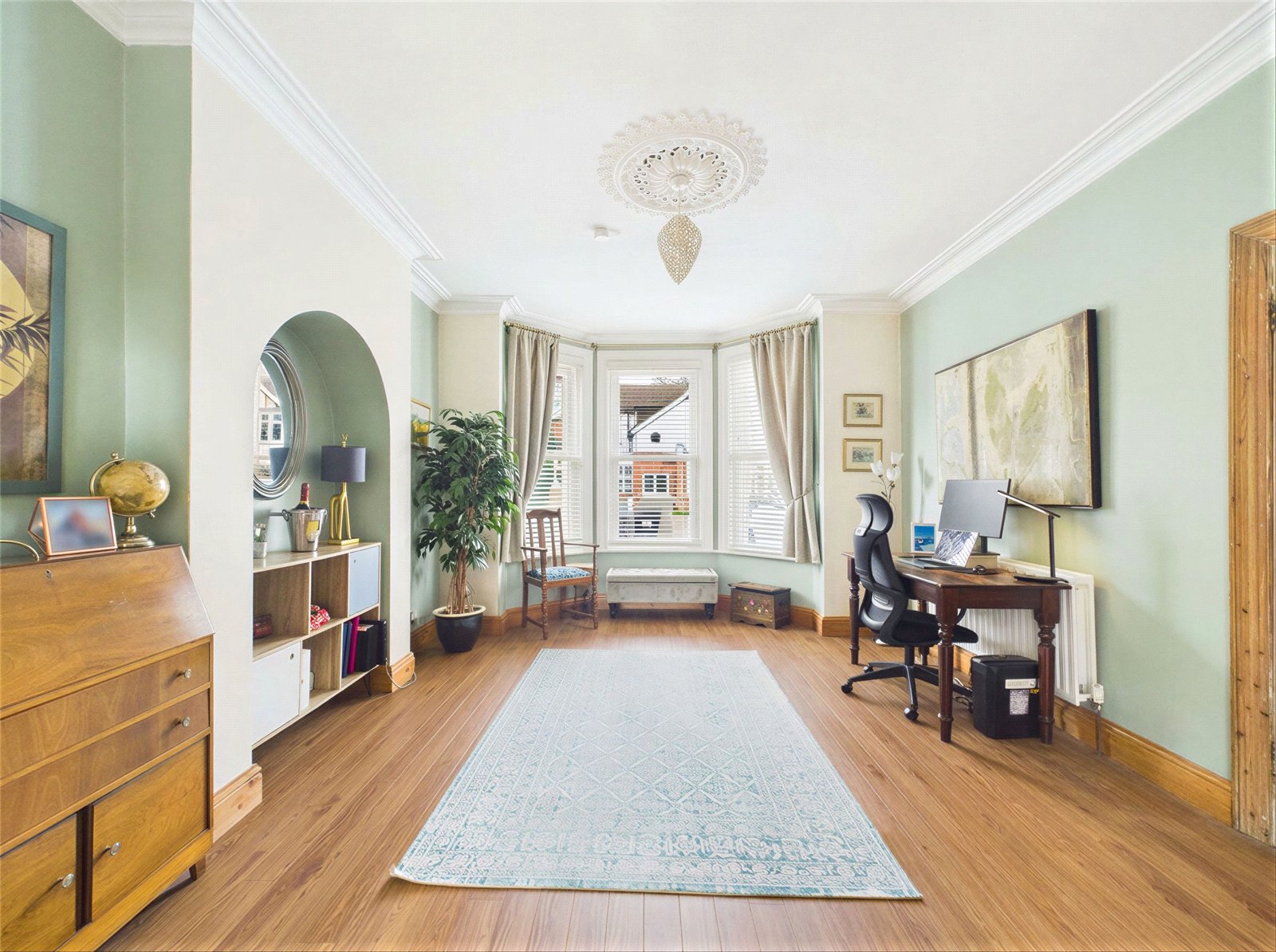 Ascending the stairs, a split-level landing features original wood flooring and useful storage, including a linen cupboard. From here, doors lead to all three double bedrooms, the family bathroom, and a separate shower room.