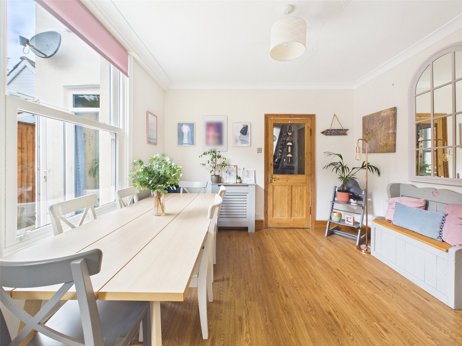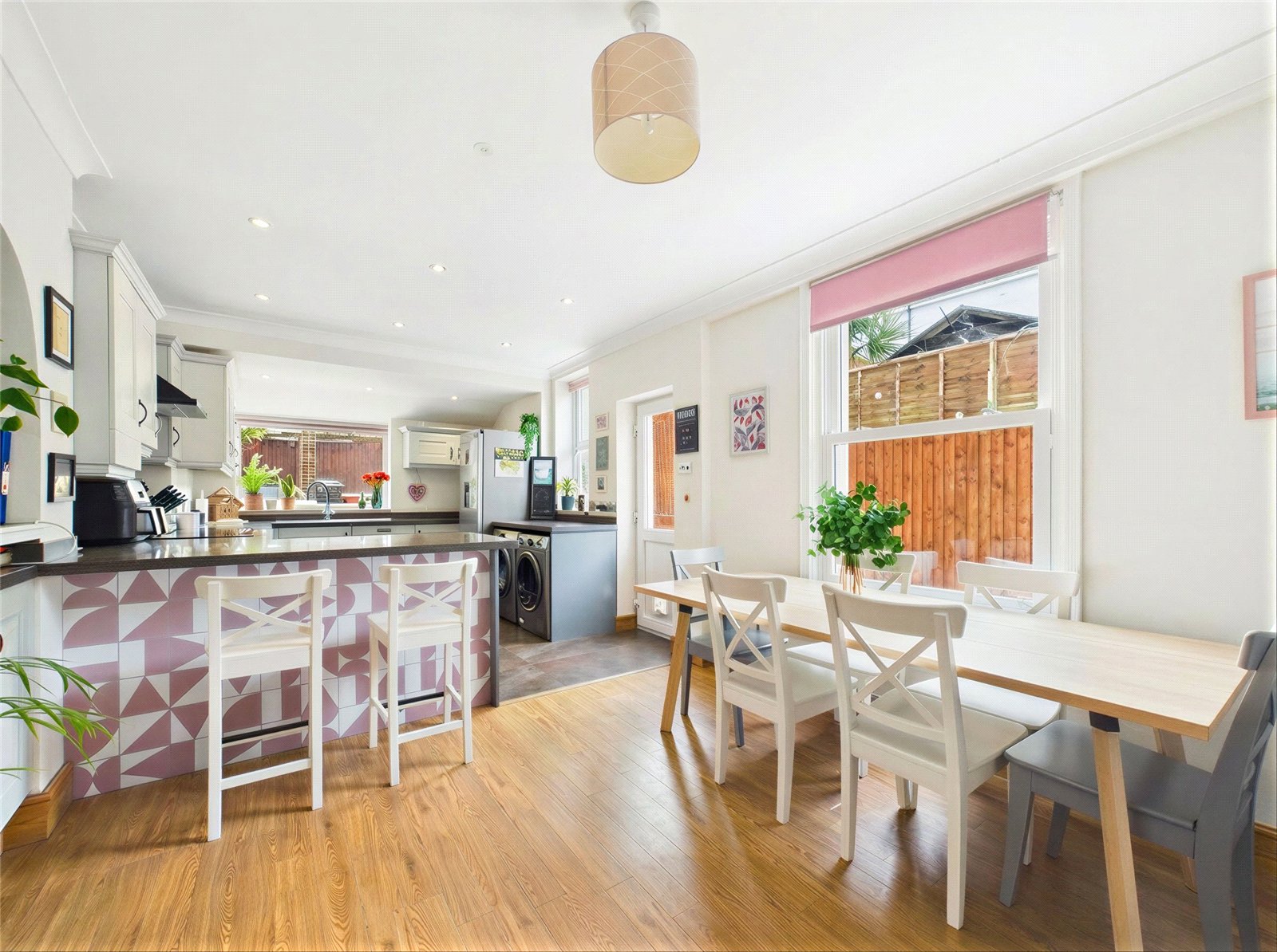 The accommodation is well-suited to family living. The ground floor comprises a charming entrance hall with original tiled flooring, a sizeable through lounge/diner with French doors opening directly onto the rear garden, and a modern kitchen/diner positioned to the rear, also providing garden access.