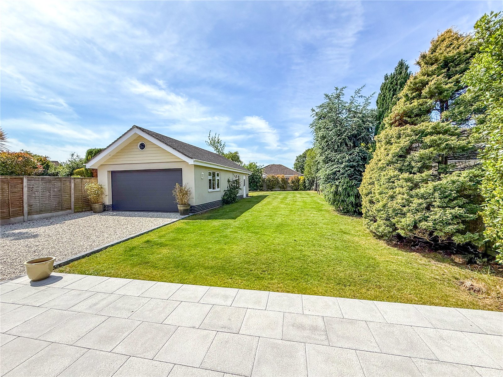 To the front of the property, a large driveway provides OFF ROAD PARKING FOR SEVERAL CARS. The driveway continues down the left hand side of the property to the DETACHED GARAGE (10.7 x 5.4m). The impressive rear garden is a key feature of this home and is laid mainly to lawn with a patio area.