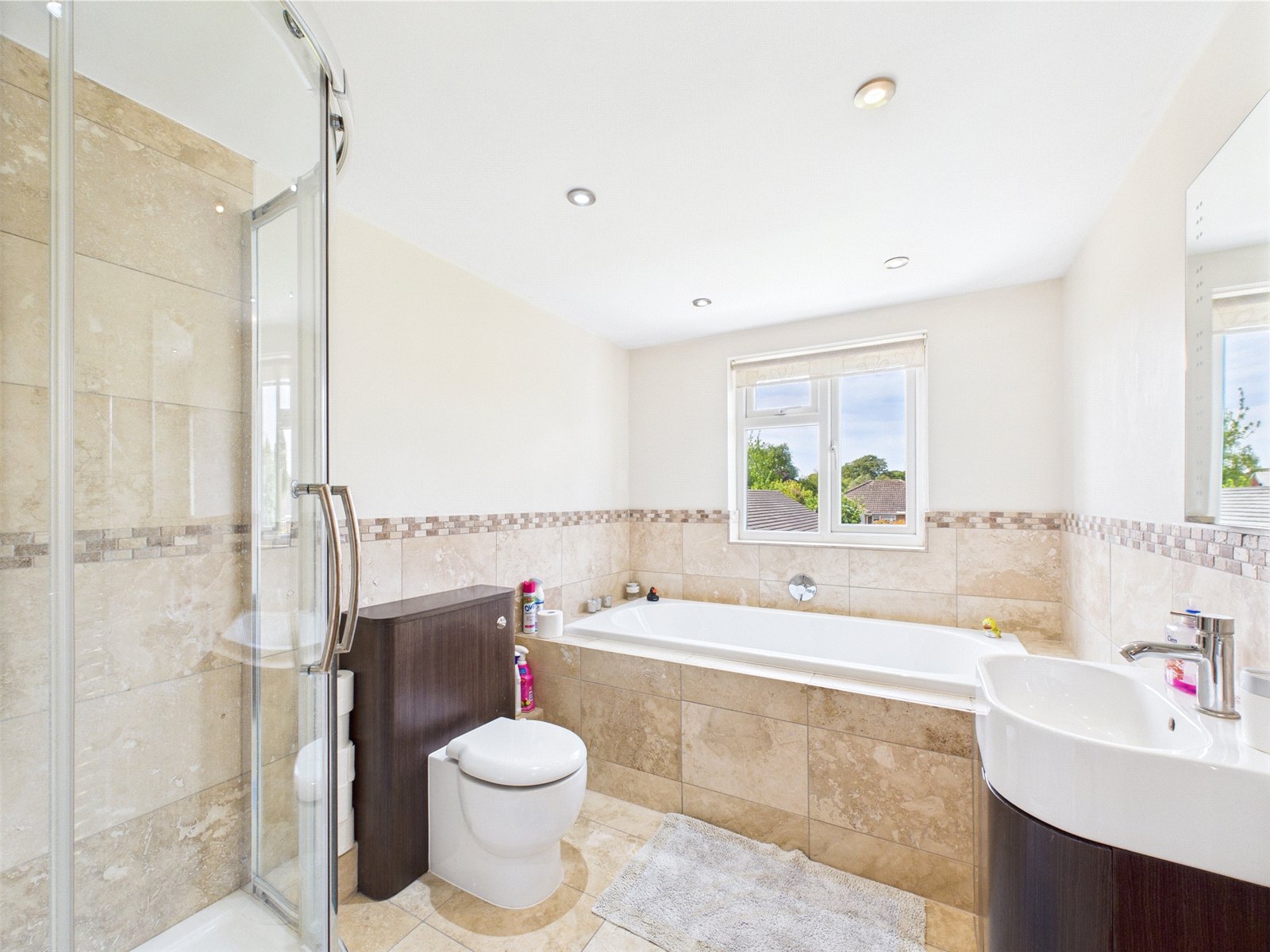 Stairs from the entrance hall lead to the first floor landing which has a useful storage cupboard. Bedroom one benefits from a dressing room and an ensuite with wc, basin and shower. There are two further bedrooms on the first floor as well as a family bathroom with wc, basin, bath and separate shower unit.