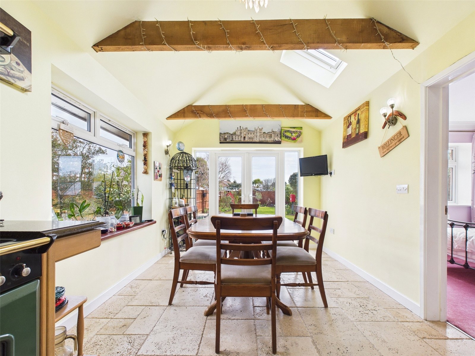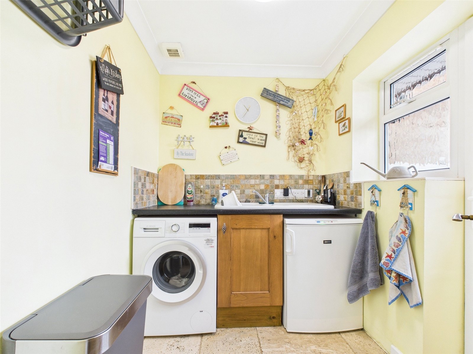 The extended kitchen diner is a bright and airy room and has an impressive vaulted ceiling at one end with Velux windows, and double doors into the garden. There is a range of eye and base level units with cupboards and drawers, some integrated appliances with space for others. A separate utility room has an additional sink and space for further appliances. Access to the front via single door.