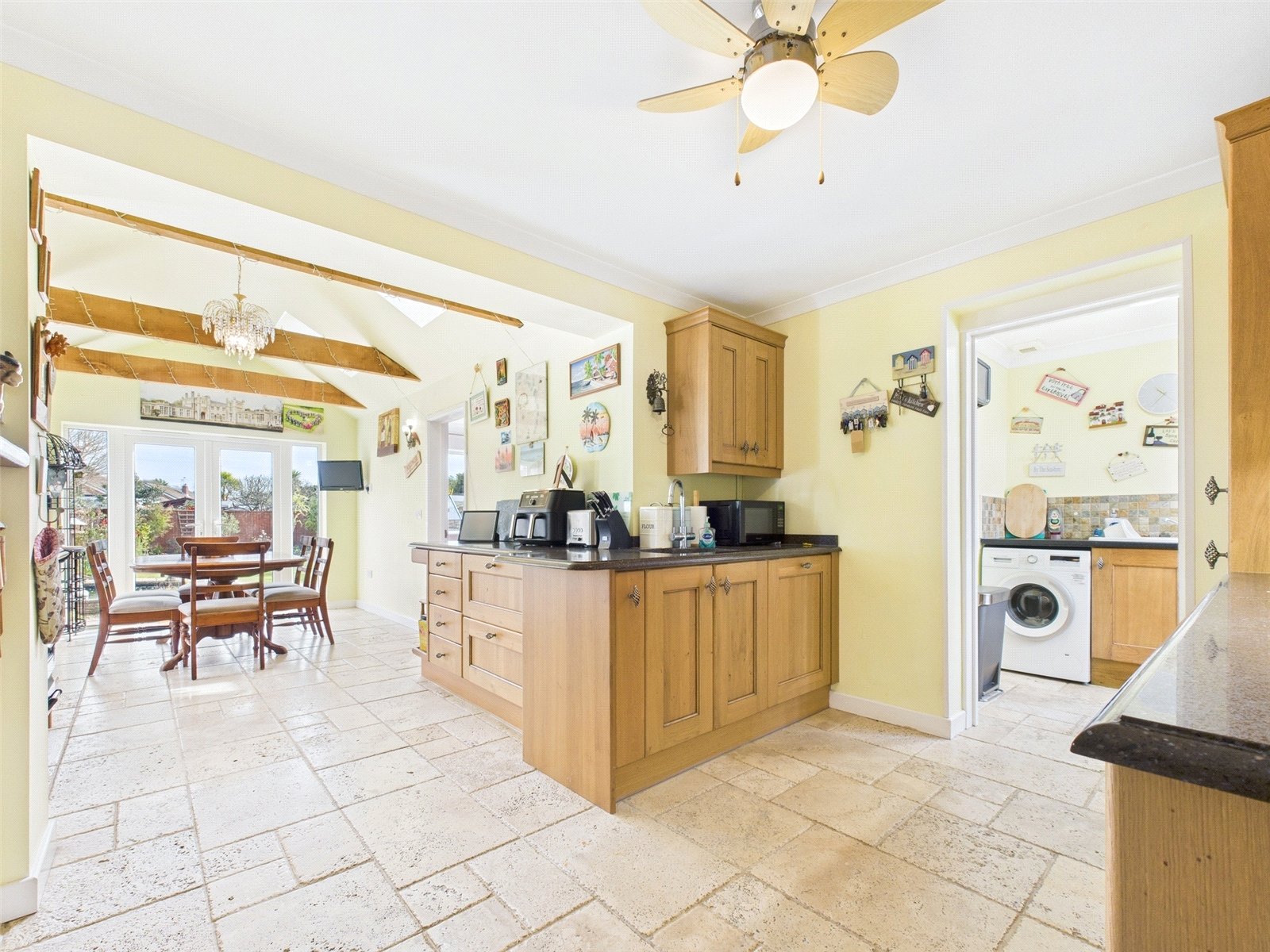 An impressively extended, three double bedroom, two bathroom detached bungalow, set on a substantial plot with a landscaped sunny rear garden and parking for several vehicles including a motorhome. Vaulted ceiling dining area with doors into the garden, and a separate utility room.