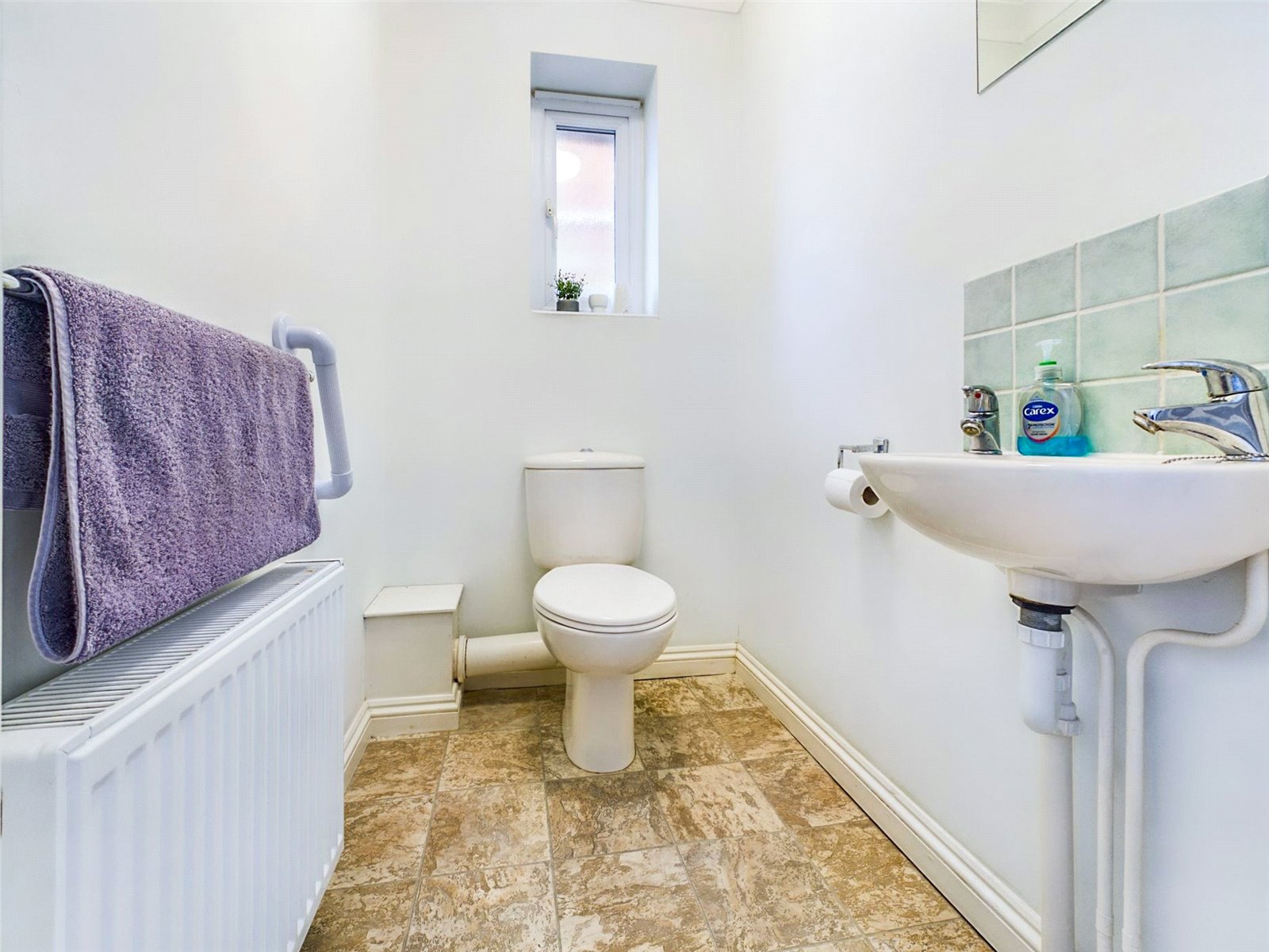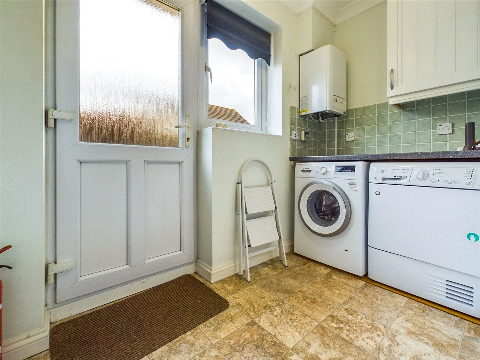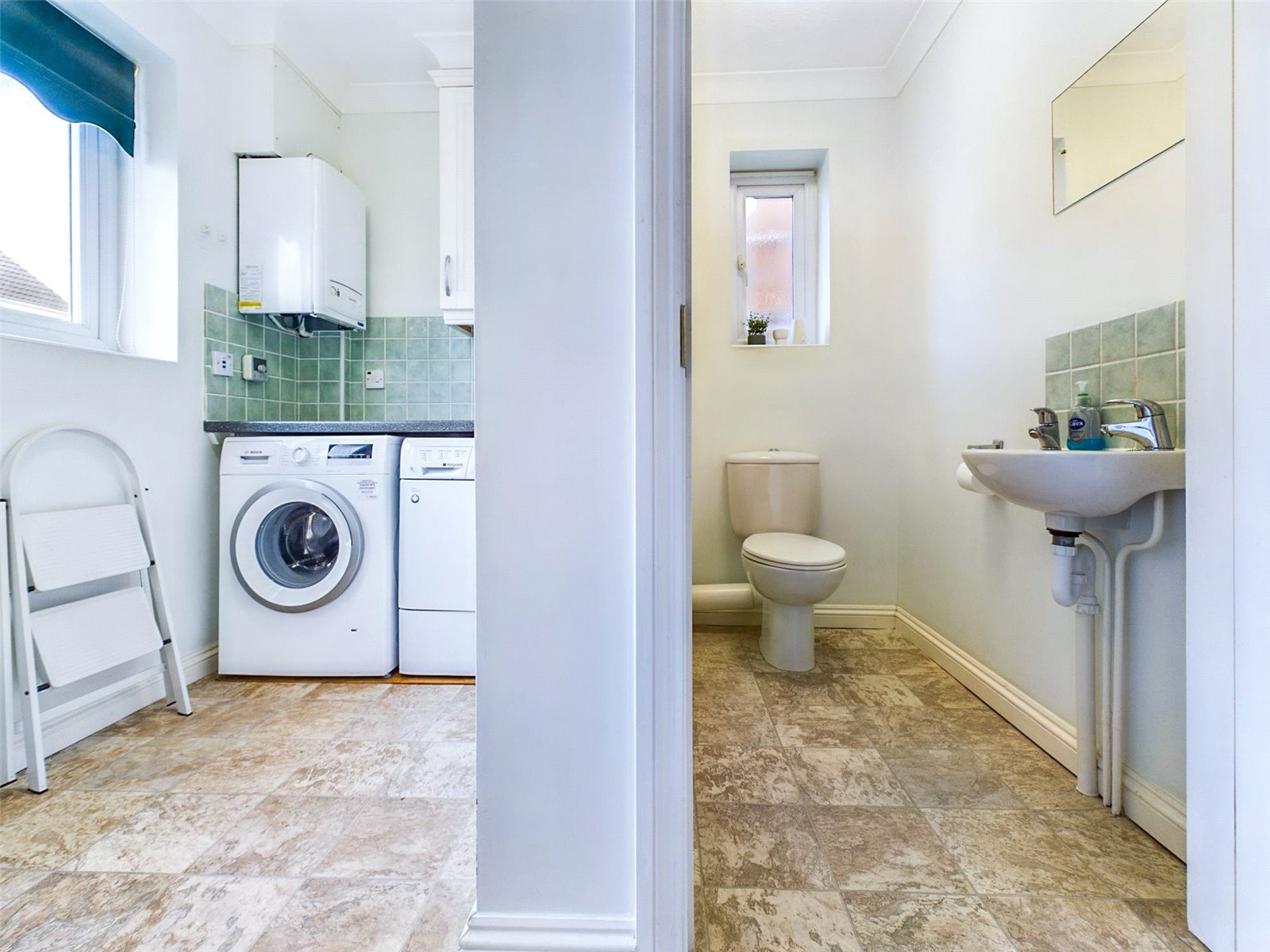 The modern kitchen comprises eye and base level units with cupboards and drawers. Integrated appliances, and a door to the utility room where the washing machine and tumble dryer are located, along with the gas boiler. Door into the garden, and further door to a ground floor WC.
