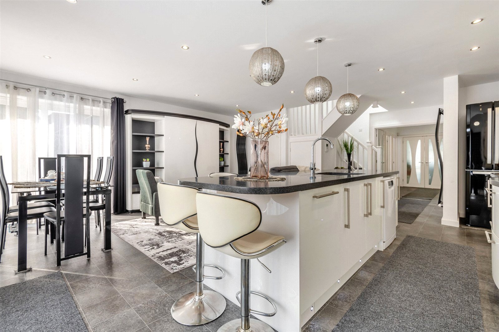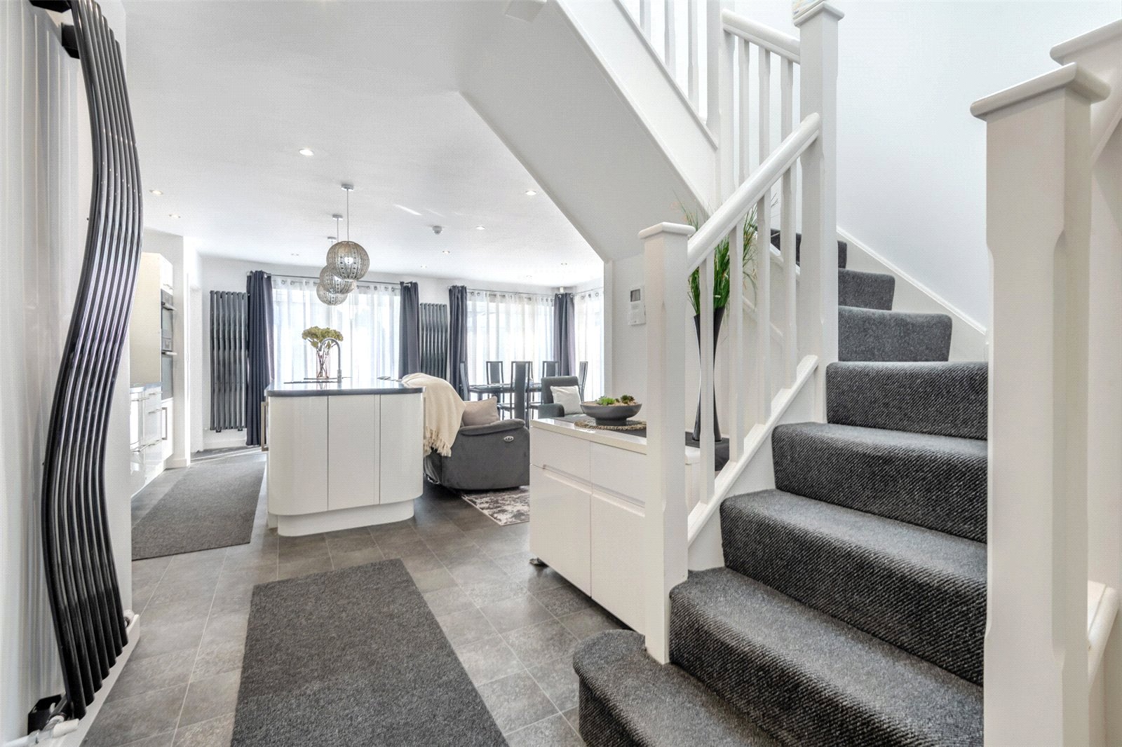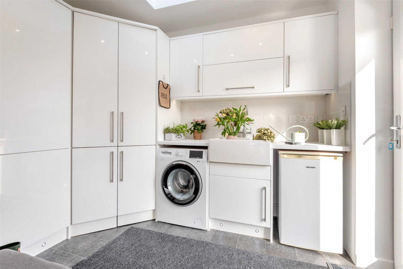 Entry is via front door and into hallway, which opens into the incredible open plan kitchen/living room via double doors. Flooded with natural light, this is a brilliant space for entertaining. The main kitchen benefits from a range of integrated appliances, including an induction hob with Corian designer hood, and plenty of storage, with a central island/breakfast bar seating. There is also a secondary "preparation" kitchen, with a gas hob, sink, built-in shelving and cupboard storage, which is currently also used as a very large walk-in pantry. A sunny utility room/ mud room is located to the rear, again with a stunning amount of storage space, with external door leading out into the garden.