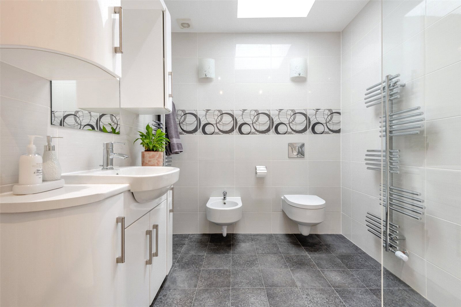 To the front of the property is a hobbies room, currently used as a second TV and music room, which could be utilised as the fourth bedroom. A separate study with fitted desks also has a wall to wall bookcase and storage space. The bedroom has fitted wardrobes and a beautifully appointed ensuite shower room with a WC and bidet. Utilising the secondary kitchen, along with this bedroom and ensuite, could make for multi-generational accommodation.