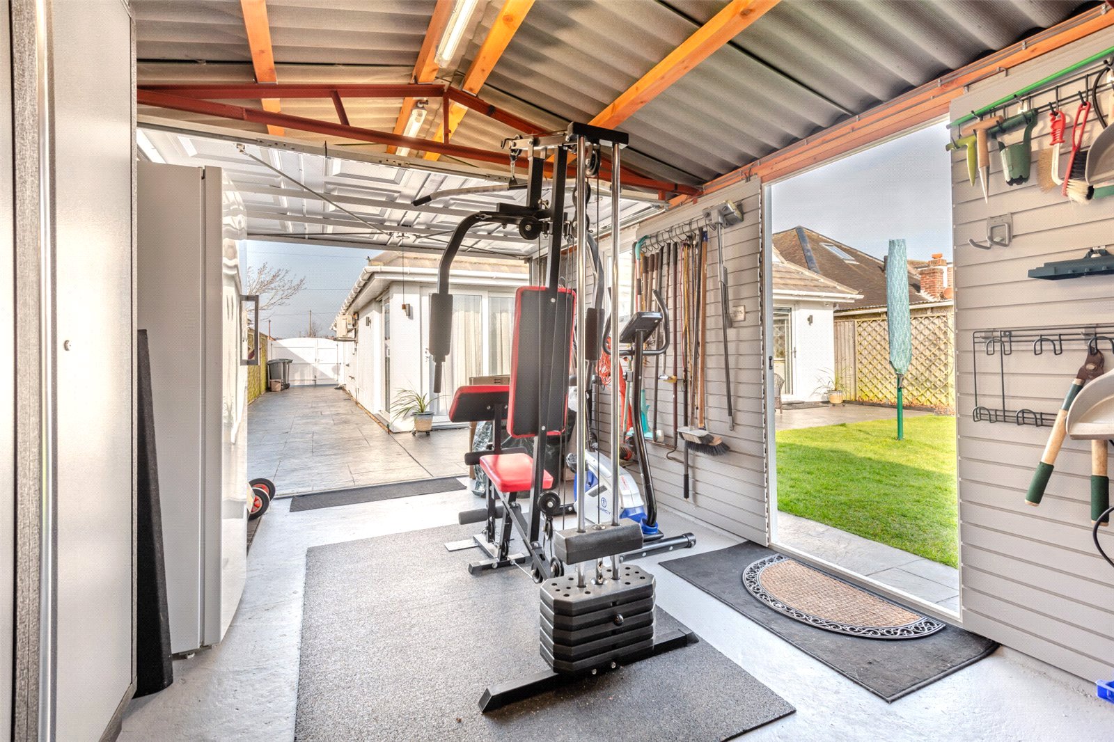 The rear garden faces southerly with a large area of patio, accessed through sliding patio doors from the living areas, lawn, herb and vegetable garden, wildlife pond, fruit trees and greenhouse. To the right hand is a driveway with double gates to the front. The garage has a fully-fitted workshop area for the handy person, additional storage and is currently also utilised as a gym.