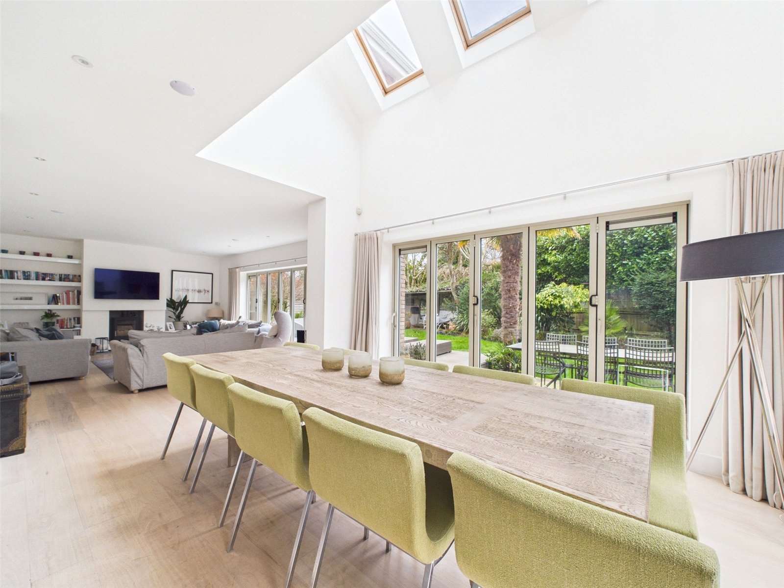 The generous living area features a fitted log burner and has bi-folding doors overlooking and leading out to the rear gardens. The dining area also has bi-folding doors leading to the rear garden as well as skylights above, and plentiful side aspect glazing making this area particularly bright.